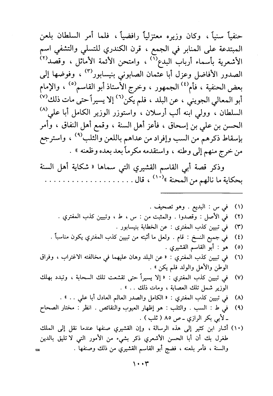 وذكر قصة أبي القاسم القشيري التي سماها "شكاية أهل السنة بحكاية ما نالهم من المحنة" (¬10)، قال. . . . . . . . . . . . . . . . . . . . .