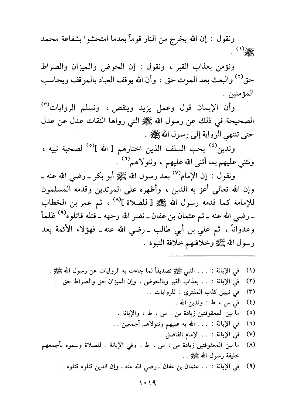 وأن الإيمان قول وعمل يزيد وينقص، ونسلم الروايات (¬3) الصحيحة في ذلك عن رسول الله - صلى الله عليه وسلم - التي رواها الثقات عدل عن عدل حتى تنتهي الرواية إلى رسول الله - صلى الله عليه وسلم -.