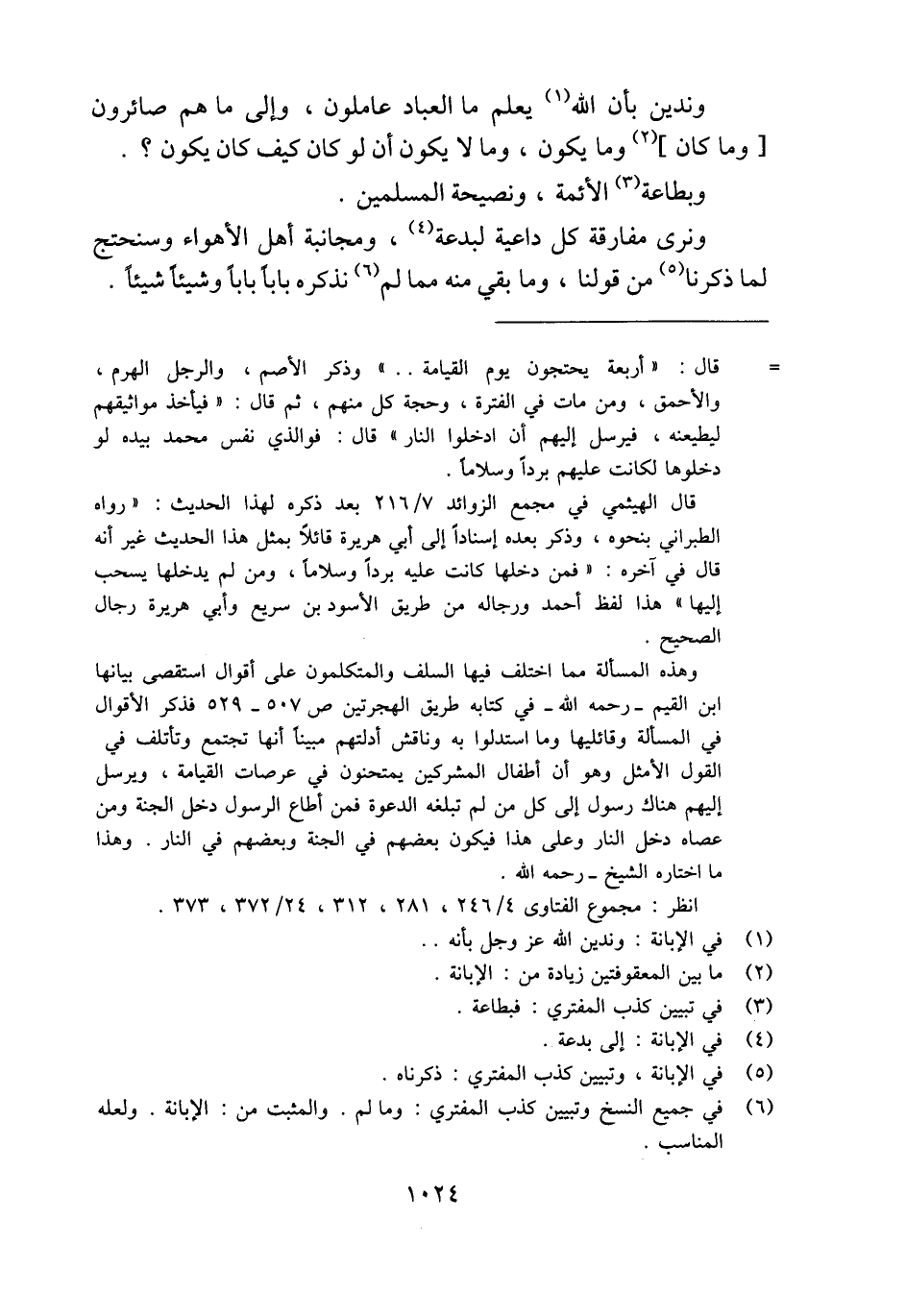 وهذه المسألة مما اختلف فيها السلف والمتكلمون على أقوال استقصى بيانها ابن القيم -رحمه الله- في كتابه طريق الهجرتين ص: 507 - 529 فذكر الأقوال في المسألة وقائليها وما استدلوا به وناقش أدلتهم مبينًا أنها تجتمع وتأتلف في القول الأمثل وهو أن أطفال المشركين يمتحنون في عرصات القيامة، ويرسل إليهم هناك رسول إلى كل من لم تبلغه الدعوة فمن أطاع الرسول دخل الجنة ومن عصاه دخل النار وعلى هذا فيكون بعضهم في الجنة وبعضهم في النار. وهذا ما اختاره الشيخ -رحمه الله.