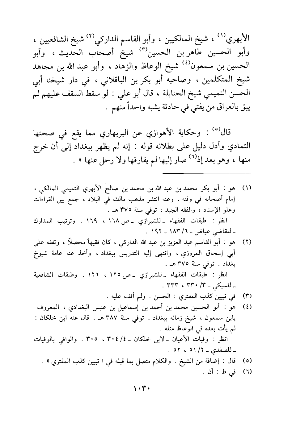 (¬1) هو: أبو بكر محمَّد بن عبد الله بن محمَّد بن صالح الأبهري التميمي المالكي، إمام أصحابه في وقته، وعنه انتشر مذهب مالك في البلاد، جمع بين القراءات وعلو الإسناد، والفقه الجيد، توفي سنة 375 هـ.