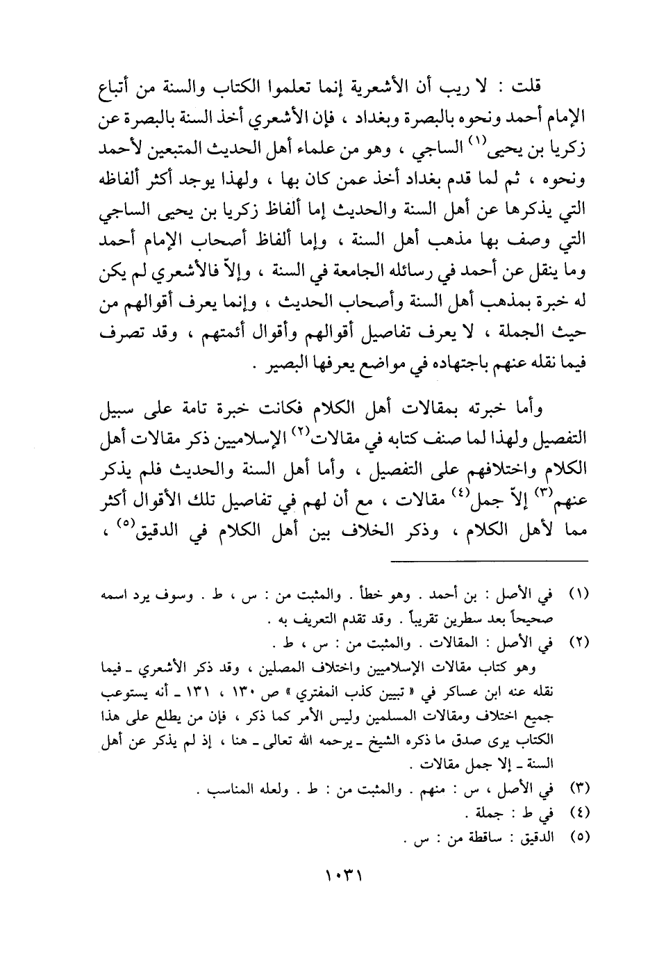وأما خبرته بمقالات أهل الكلام فكانت خبرة تامة على سبيل التفصيل ولهذا لما صنف كتابه في مقالات (¬2) الإِسلاميين ذكر مقالات أهل الكلام واختلافهم على التفصيل، وأما أهل السنة والحديث فلم يذكر عنهم (¬3) إلّا جمل (¬4) مقالات، مع أن لهم في تفاصيل تلك الأقوال أكثر مما لأهل الكلام، وذكر الخلاف بين أهل الكلام في الدقيق (¬5)،