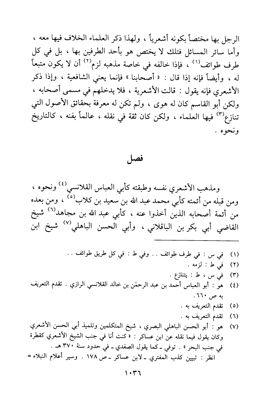 (¬7) هو: أبو الحسن الباهلي البصري، شيخ المتكلمين وتلميذ أبي الحسن الأشعري وكان يقول فيما نقله عن ابن عساكر: "كنت أنا في جنب الشيخ الأشعري كقطرة في جنب البحر". توفي -كما يقول الصفدي- في حدود سنة 370 هـ.