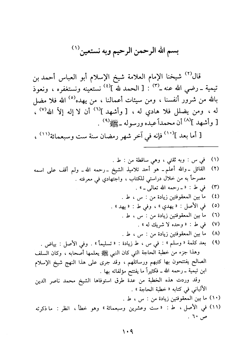 قال (¬2) شيخنا الإِمام العلامة شيخ الإِسلام أبو العباس أحمد بن تيمية - رضي الله عنه - (¬3): [الحمد لله] (¬4) نستعينه ونستغفره، ونعوذ بالله من شرور أنفسنا، ومن سيئات أعمالنا، من يهده (¬5) الله فلا مضل له، ومن يضلل فلا هادي له، [وأشهد] (¬6) أن لا إله إلّا الله (¬7)، [وأشهد] (¬8) أن محمدًا عبده ورسوله- صلى الله عليه وسلم - (¬9).