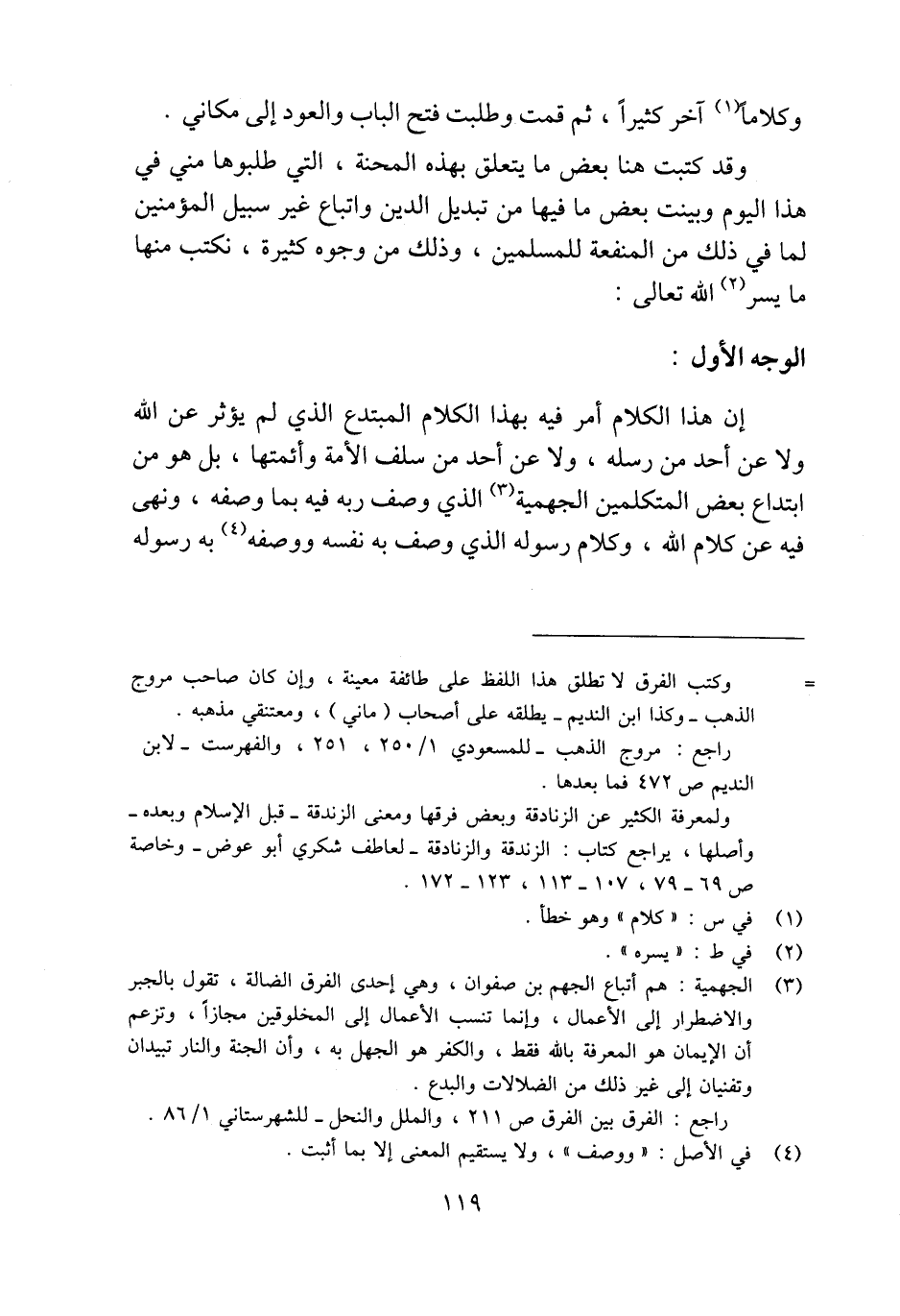 وقد كتبت هنا بعض ما يتعلق بهذه المحنة، التي طلبوها مني في هذا اليوم وبينت بعض ما فيها من تبديل الدين واتباع غير سبيل المؤمنين لما في ذلك من المنفعة للمسلمين، وذلك من وجوه كثيرة، نكتب منها ما يسر (¬2) الله تعالى: