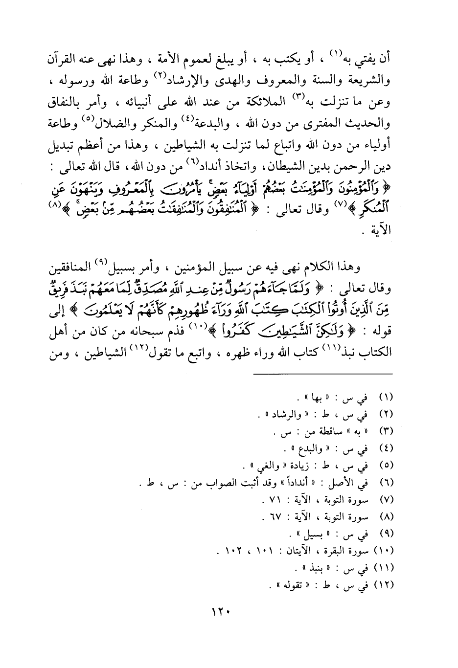 أن يفتي به (¬1)، أو يكتب به، أو يبلغ لعموم الأمة، وهذا نهى عنه القرآن والشريعة والسنة والمعروف والهدى والإرشاد (¬2) وطاعة الله ورسوله، وعن ما تنزلت به (¬3) الملائكة من عند الله على أنبيائه، وأمر بالنفاق والحديث المفترى من دون الله، والبدعة (¬4) والمنكر والضلال (¬5) وطاعة أولياء من دون الله واتباع لما تنزلت به الشياطين، وهذا من أعظم تبديل دين الرحمن بدين الشيطان، واتخاذ أنداد (¬6) من دون الله، قال الله تعالى: {وَالْمُؤْمِنُونَ وَالْمُؤْمِنَاتُ بَعْضُهُمْ أَوْلِيَاءُ بَعْضٍ يَأْمُرُونَ بِالْمَعْرُوفِ وَيَنْهَوْنَ عَنِ الْمُنْكَرِ} (¬7) وقال تعالى: {الْمُنَافِقُونَ وَالْمُنَافِقَاتُ بَعْضُهُمْ مِنْ بَعْضٍ} (¬8) الآية.