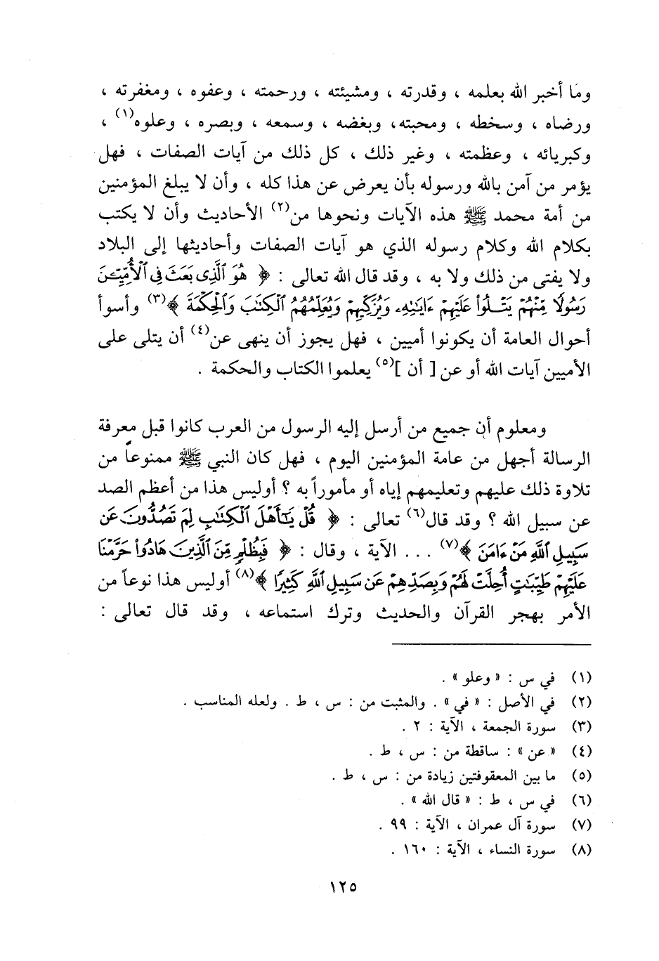 وما أخبر الله بعلمه، وقدرته، ومشيئته، ورحمته، وعفوه، ومغفرته، ورضاه، وسخطه، ومحبته، وبغضه، وسمعه، وبصره، وعلوه (¬1)، وكبريائه، وعظمته، وغير ذلك، كل ذلك من آيات الصفات، فهل يؤمر من آمن بالله ورسوله بأن يعرض عن هذا كله، وأن لا يبلغ المؤمنين من أمة محمَّد - صلى الله عليه وسلم - هذه الآيات ونحوها من (¬2) الأحاديث وأن لا يكتب بكلام الله وكلام رسوله الذي هو آيات الصفات وأحاديثها إلى البلاد ولا يفتى من ذلك ولا به، وقد قال الله تعالى: {هُوَ الَّذِي بَعَثَ فِي الْأُمِّيِّينَ رَسُولًا مِنْهُمْ يَتْلُو عَلَيْهِمْ آيَاتِهِ وَيُزَكِّيهِمْ وَيُعَلِّمُهُمُ الْكِتَابَ وَالْحِكْمَةَ} (¬3) وأسوأ أحوال العامة أن يكونوا أميين، فهل يجوز أن ينهى عن (¬4) أن يتلى على الأميين آيات الله أو عن [أن] (¬5) يعلموا الكتاب والحكمة.