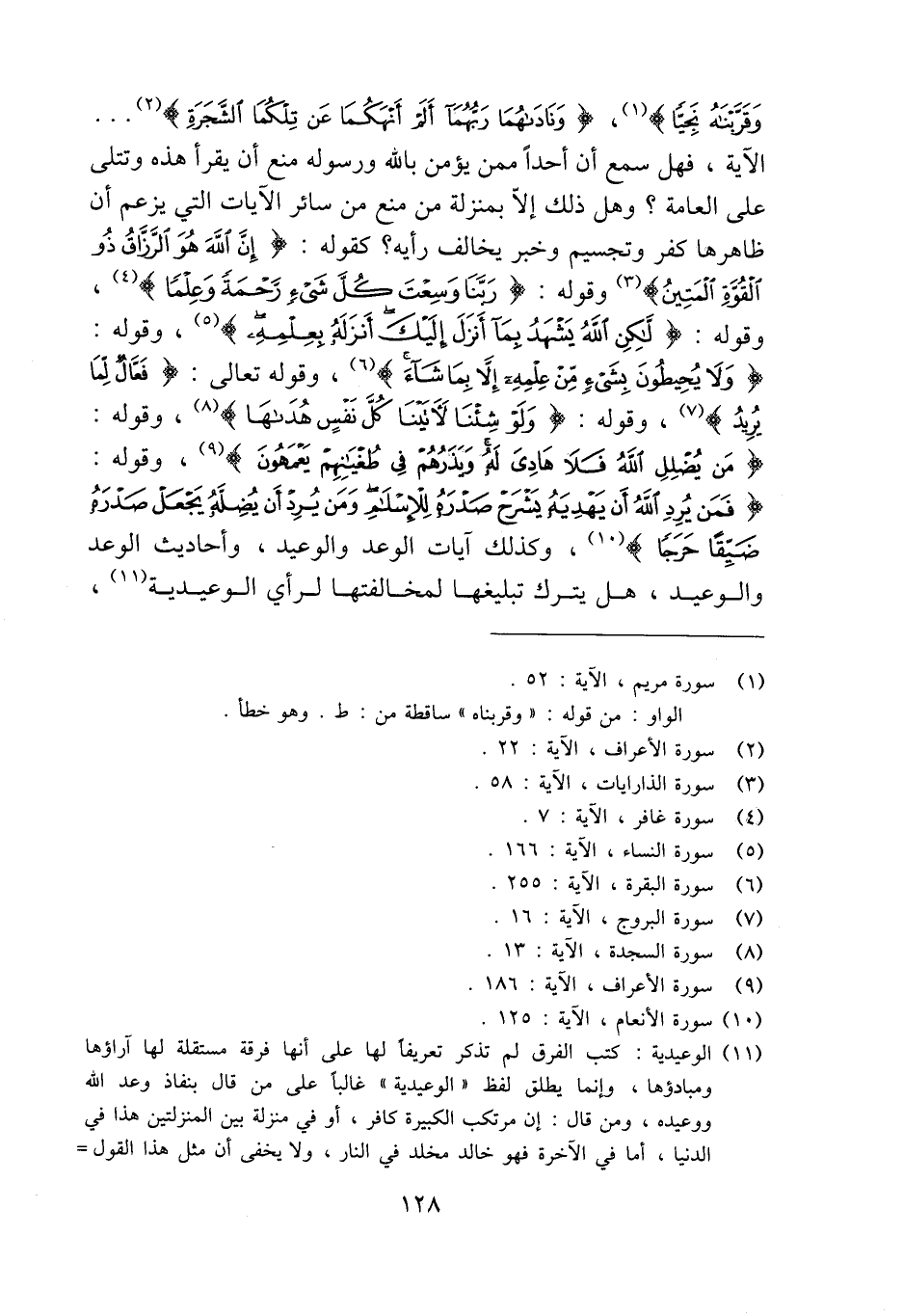 وَقَرَّبْنَاهُ نَجِيًّا} (¬1)، {وَنَادَاهُمَا رَبُّهُمَا أَلَمْ أَنْهَكُمَا عَنْ تِلْكُمَا الشَّجَرَةِ} (¬2). . . الآية، فهل سمع أن أحدًا ممن يؤمن بالله ورسوله منع أن يقرأ هذه وتتلى على العامة؟ وهل ذلك إلَّا بمنزلة من منع من سائر الآيات التي يزعم أن ظاهرها كفر وتجسيم وخبر يخالف رأيه؟ كقوله: {إِنَّ اللَّهَ هُوَ الرَّزَّاقُ ذُو الْقُوَّةِ الْمَتِينُ} (¬3) وقوله: {رَبَّنَا وَسِعْتَ كُلَّ شَيْءٍ رَحْمَةً وَعِلْمًا} (¬4)، وقوله: {لَكِنِ اللَّهُ يَشْهَدُ بِمَا أَنْزَلَ إِلَيْكَ أَنْزَلَهُ بِعِلْمِهِ} (¬5)، وقوله: {وَلَا يُحِيطُونَ بِشَيْءٍ مِنْ عِلْمِهِ إلا بِمَا شَاءَ} (¬6)، وقوله تعالى: {فَعَّالٌ لِمَا يُرِيدُ} (¬7)، وقوله: {وَلَوْ شِئْنَا لَآتَيْنَا كُلَّ نَفْسٍ هُدَاهَا} (¬8)، وقوله: {مَنْ يُضْلِلِ اللَّهُ فَلَا هَادِيَ لَهُ وَيَذَرُهُمْ فِي طُغْيَانِهِمْ يَعْمَهُونَ} (¬9)، وقوله: {فَمَنْ يُرِدِ اللَّهُ أَنْ يَهْدِيَهُ يَشْرَحْ صَدْرَهُ لِلْإِسْلَامِ وَمَنْ يُرِدْ أَنْ يُضِلَّهُ يَجْعَلْ صَدْرَهُ ضَيِّقًا حَرَجًا} (¬10)، وكذلك آيات الوعد والوعيد، وأحاديث الوعد والوعيد، هل يترك تبليغها لمخالفتها لرأي الوعيدية (¬11)،
