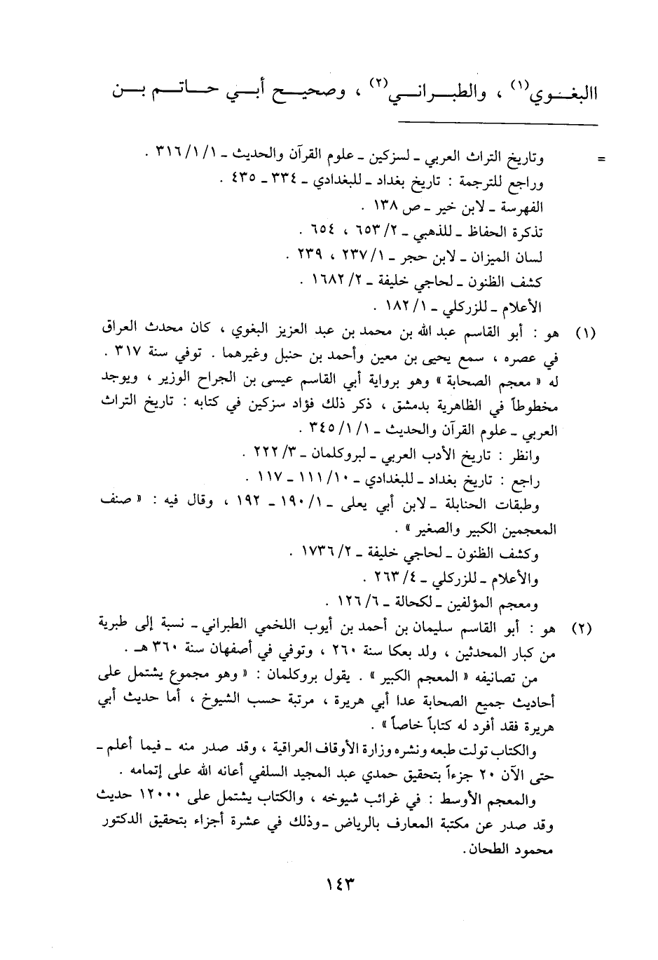 (¬1) هو: أبو القاسم عبد الله بن محمَّد بن عبد العزيز البغوي، كان محدث العراق في عصره، سمع يحيى بن معين وأحمد بن حنبل وغيرهما. توفي سنة 317. له "معجم الصحابة" وهو برواية أبي القاسم عيسى بن الجراح الوزير، ويوجد مخطوطًا في الظاهرية بدمشق، ذكر ذلك فؤاد سزكين في كتابه: تاريخ التراث العربي -علوم القرآن والحديث- 1/ 1 / 345.