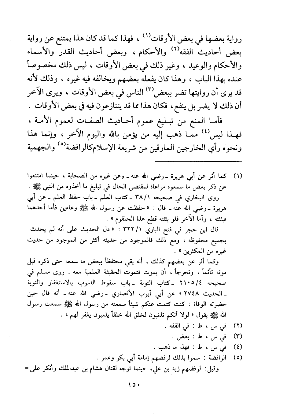 (¬1) كما أثر عن أبي هريرة - رضي الله عنه - وعن غيره من الصحابة، حينما امتنعوا عن ذكر بعض ما سمعوه مراعاة لمقتضى الحال في تبليغ ما أخذوه من النبي - صلى الله عليه وسلم -.
