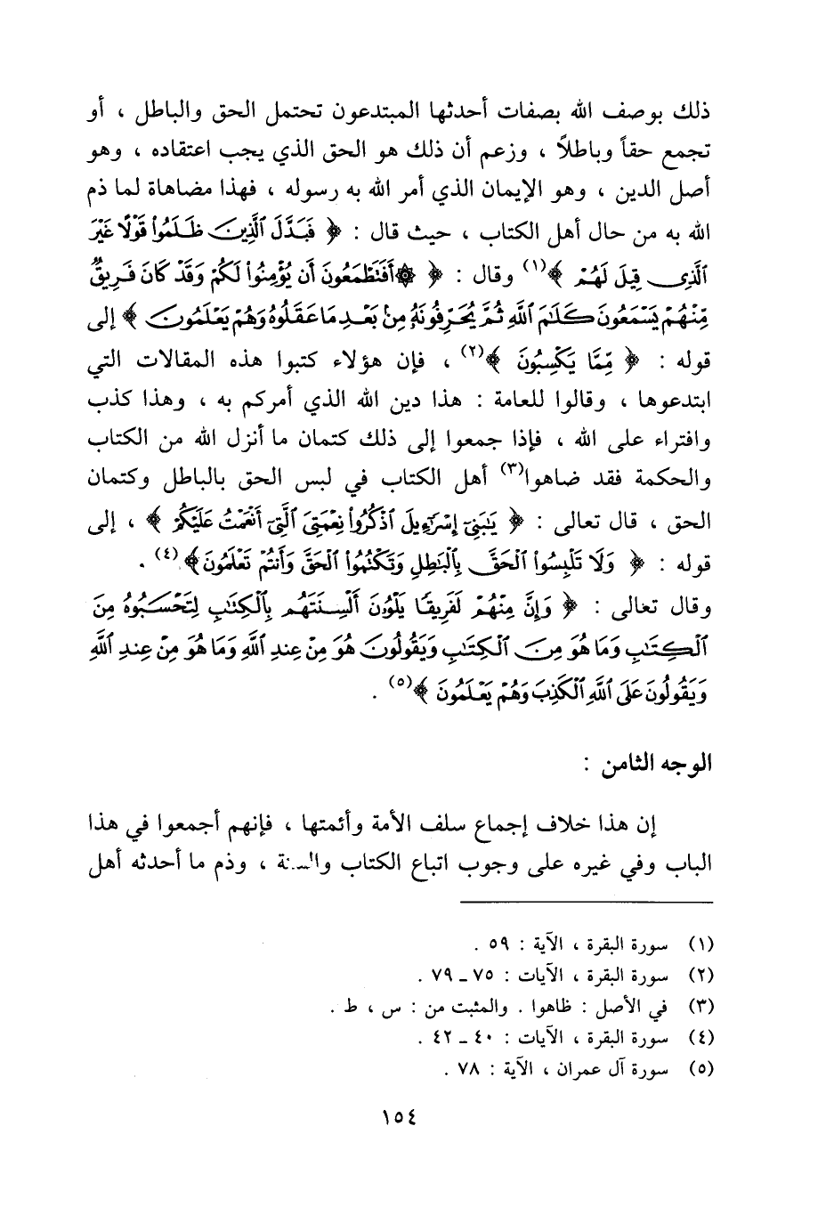 ذلك بوصف الله بصفات أحدثها المبتدعون تحتمل الحق والباطل، أو تجمع حقًّا وباطلًا، وزعم أن ذلك هو الحق الذي يجب اعتقاده، وهو أصل الدين، وهو الإيمان الذي أمر الله به رسوله، فهذا مضاهاة لما ذم الله به من حال أهل الكتاب، حيث قال: {فَبَدَّلَ الَّذِينَ ظَلَمُوا قَوْلًا غَيْرَ الَّذِي قِيلَ لَهُمْ} (¬1) وقال: {أَفَتَطْمَعُونَ أَنْ يُؤْمِنُوا لَكُمْ وَقَدْ كَانَ فَرِيقٌ مِنْهُمْ يَسْمَعُونَ كَلَامَ اللَّهِ ثُمَّ يُحَرِّفُونَهُ مِنْ بَعْدِ مَا عَقَلُوهُ وَهُمْ يَعْلَمُونَ} إلى قوله: {مِمَّا يَكْسِبُونَ} (¬2)، فإن هؤلاء كتبوا هذه المقالات التي ابتدعوها، وقالوا للعامة: هذا دين الله الذي أمركم به، وهذا كذب وافتراء على الله، فإذا جمعوا إلى ذلك كتمان ما أنزل الله من الكتاب والحكمة فقد ضاهوا (¬3) أهل الكتاب في لبس الحق بالباطل وكتمان الحق، قال تعالى: {يَابَنِي إِسْرَائِيلَ اذْكُرُوا نِعْمَتِيَ الَّتِي أَنْعَمْتُ عَلَيْكُمْ}، إلى قوله: {وَلَا تَلْبِسُوا الْحَقَّ بِالْبَاطِلِ وَتَكْتُمُوا الْحَقَّ وَأَنْتُمْ تَعْلَمُونَ} (¬4).