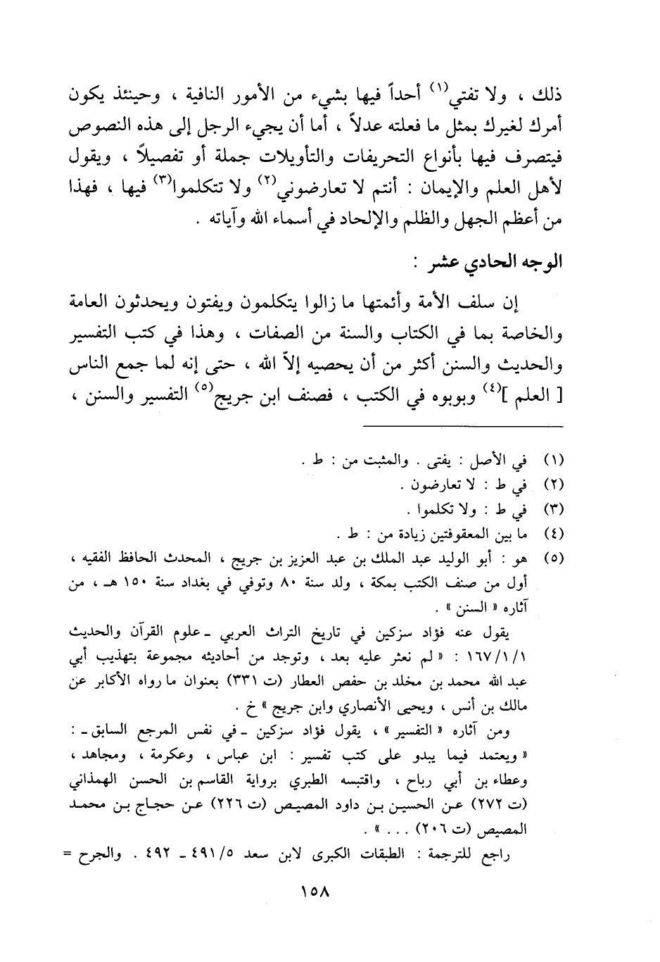 إن سلف الأمة وأئمتها ما زالوا يتكلمون ويفتون ويحدثون العامة والخاصة بما في الكتاب والسنة من الصفات، وهذا في كتب التفسير والحديث والسنن أكثر من أن يحصيه إلّا الله، حتى إنه لما جمع الناس [العلم] (¬4) وبوبوه في الكتب، فصنف ابن جريج (¬5) التفسير والسنن،