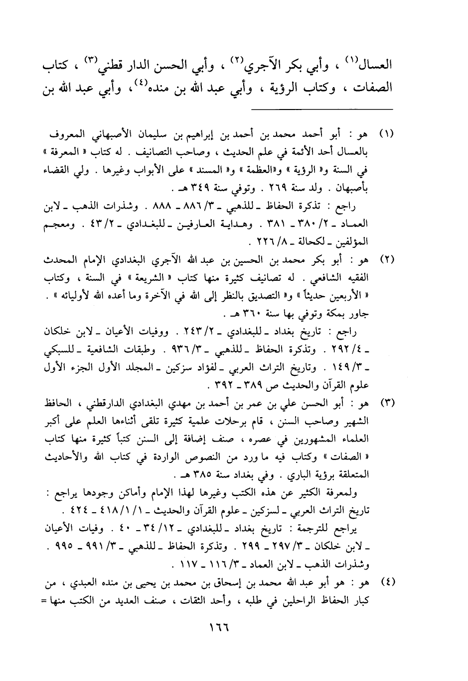 العسال (¬1)، وأبي بكر الآجري (¬2)، وأبي الحسن الدارقطني (¬3)، كتاب الصفات، وكتاب الرؤية، وأبي عبد الله بن منده (¬4)، وأبي عبد الله بن