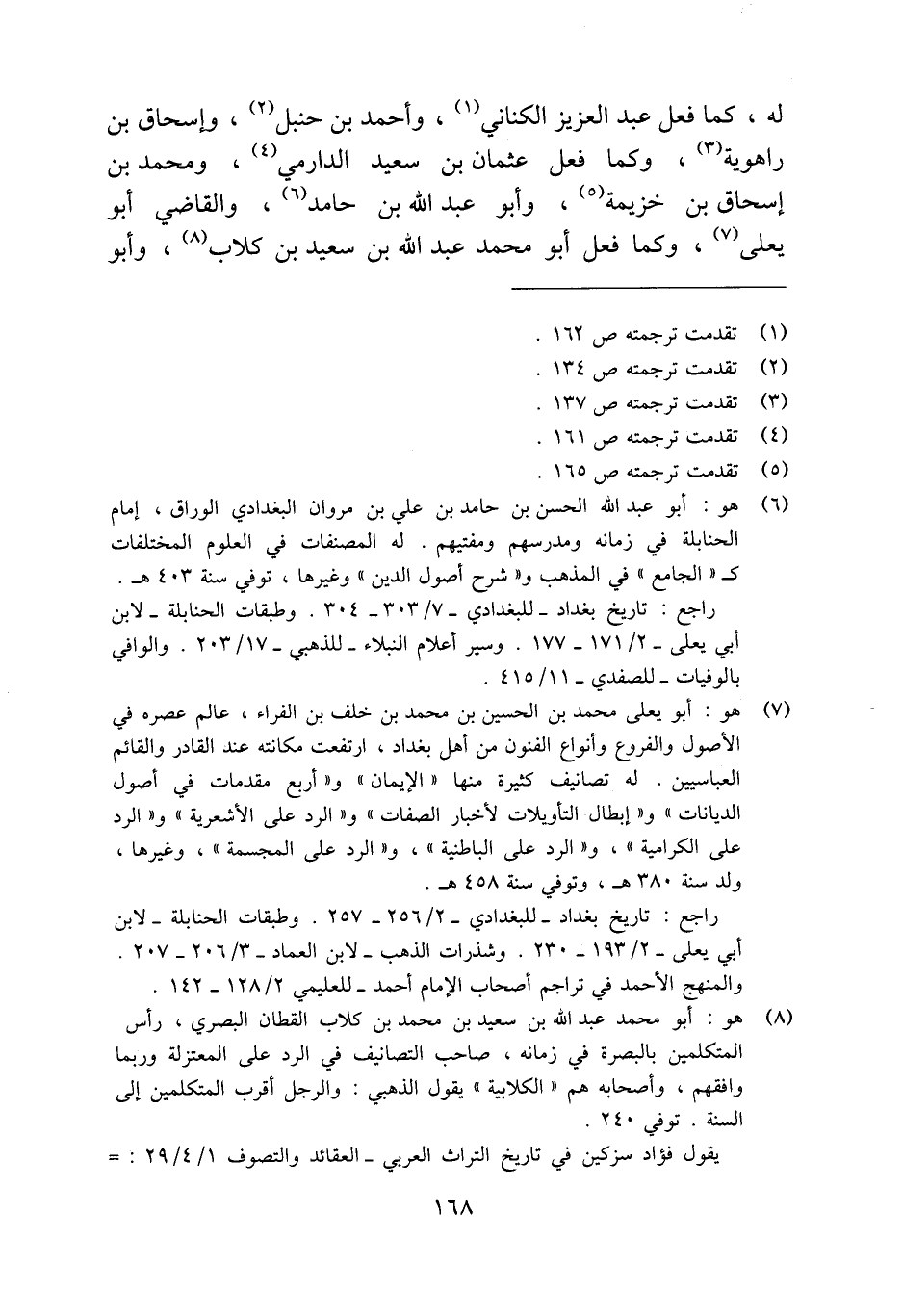 (¬7) هو: أبو يعلى محمد بن الحسين بن محمد بن خلف بن الفراء، عالم عصره في الأصول والفروع وأنواع الفنون من أهل بغداد، ارتفعت مكانته عند القادر والقائم العباسيين. له تصانيف كثيرة منها "الإيمان" و"أربع مقدمات في أصول الديانات" و"إبطال التأويلات لأخبار الصفات" و"الرد على الأشعرية" و"الرد على الكرامية"، و"الرد على الباطنية"، و"الرد على المجسمة"، وغيرها، ولد سنة 380 هـ، وتوفي سنة 458 هـ.