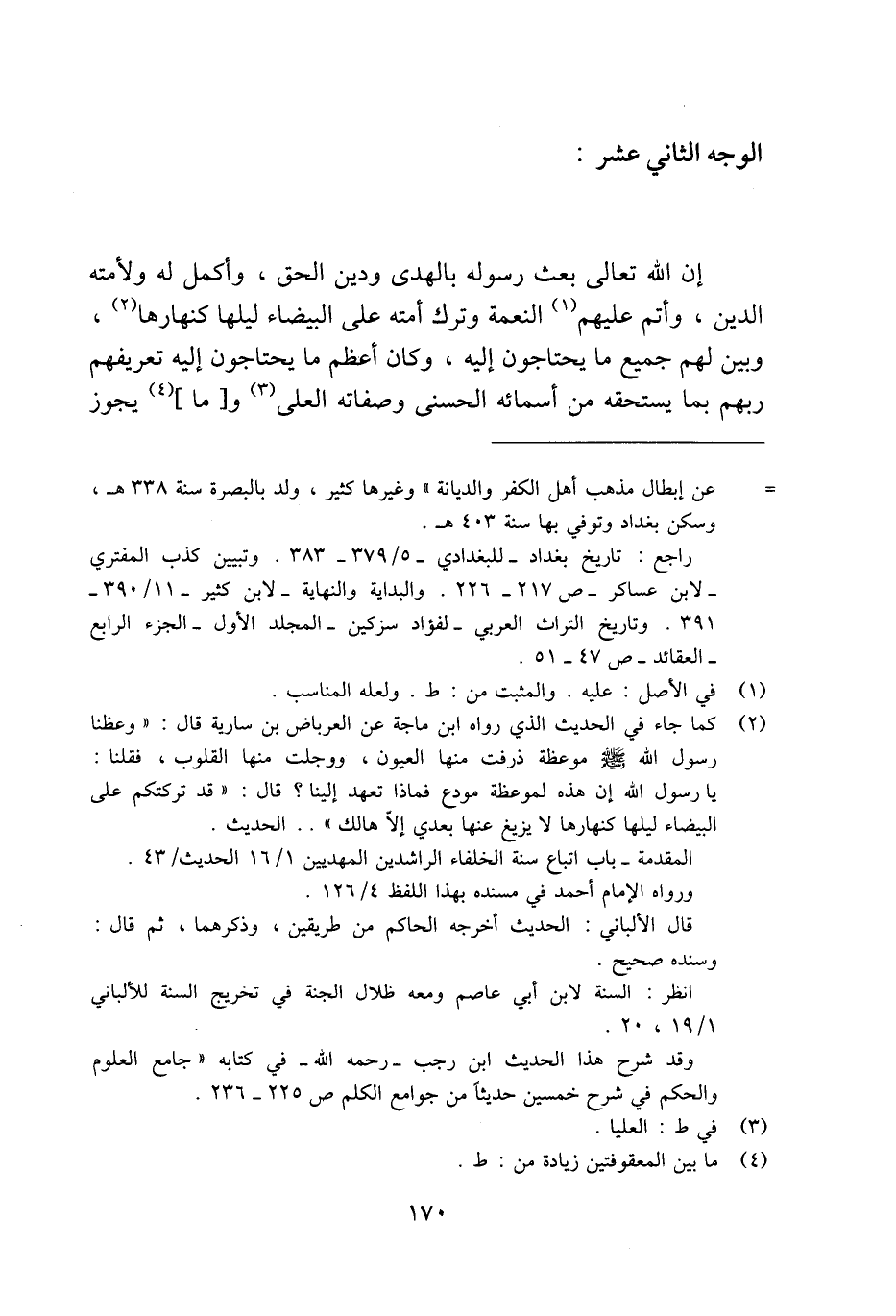 (¬2) كما جاء في الحديث الذي رواه ابن ماجة عن العرباض بن سارية قال: "وعظنا رسول الله - صلى الله عليه وسلم - موعظة ذرفت منها الدِون، ووجلت منها القلوب، فقلنا: يا رسول الله إن هذه لموعظة مودع فماذا تعهد إلينا؟ قال: "قد تركتكم على البيضاء ليلها كنهارها لا يزيغ عنها بعدي إلّا هالك". . الحديث.