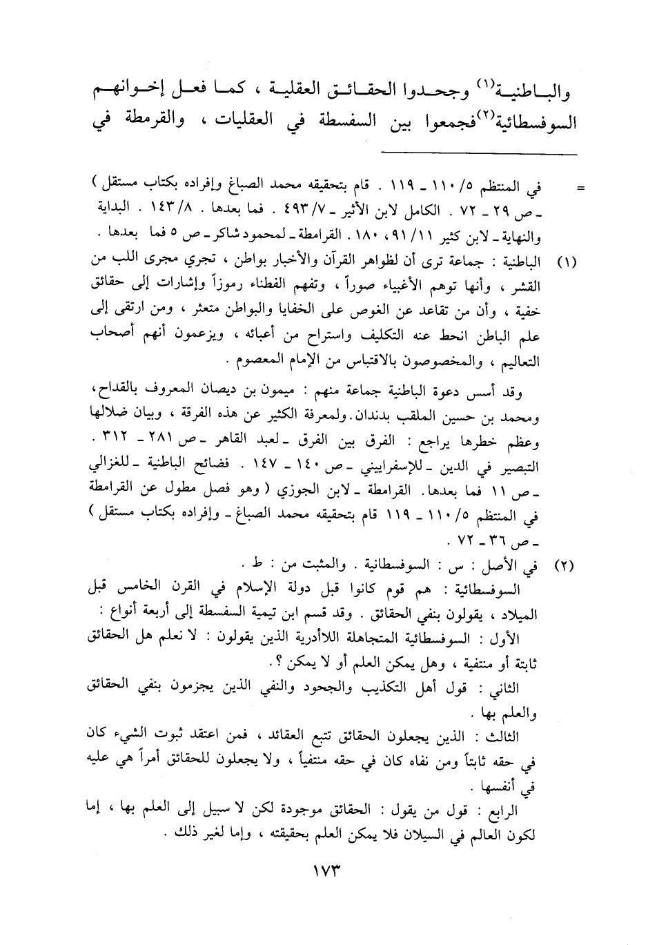 والباطنية (¬1) وجحدوا الحقائق العقلية، كما فعل إخوانهم السوفسطائية (¬2) فجمعوا بين السفسطة في العقليات، والقرمطة في