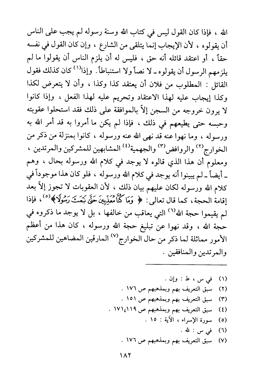 الله، فإذا كان القول ليس في كتاب الله وسنة رسوله لم يجب على الناس أن يقولوه، لأن الإيجاب إنما يتلقى من الشارع، وإن كان القول في نفسه حقًّا، أو اعتقد قائله أنه حق، فليس له أن يلزم الناس أن يقولوا ما لم يلزمهم الرسول أن يقولوه -لا نصًّا ولا استنباطًا. وإذا (¬1) كان كذلك فقول القائل: المطلوب من فلان أن يعتقد كذا وكذا، وأن لا يتعرض لكذا وكذا إيجاب عليه لهذا الاعتقاد وتحريم عليه لهذا الفعل، وإذا كانوا لا يرون خروجه من السجن إلّا بالموافقة على ذلك فقد استحلوا عقوبته وحبسه حتى يطيعهم في ذلك، فإذا لم يكن ما أمروا به قد أمر الله به ورسوله، وما نهوا عنه قد نهى الله عنه ورسوله، كانوا بمنزلة من ذكر من الخوارج (¬2) والروافض (¬3) والجهمية (¬4) المشابهين للمشركين والمرتدين، ومعلوم أن هذا الذي قالوه لا يوجد في كلام الله ورسوله بحال، وهم -أيضًا- لم يبينوا أنه يوجد في كلام الله ورسوله، فلو كان هذا موجودًا في كلام الله ورسوله لكان عليهم بيان ذلك، لأن العقوبات لا تجوز إلّا بعد إقامة الحجة، كما قال تعالى: {وَمَا كُنَّا مُعَذِّبِينَ حَتَّى نَبْعَثَ رَسُولًا} (¬5)، فإذا لم يقيموا حجة الله (¬6) التي يعاقب من خالفها، بل لا يوجد ما ذكروه في حجة الله، وقد نهوا عن تبليغ حجة الله ورسوله، كان هذا من أعظم الأمور مماثلة لما ذكر من حال الخوارج (¬7) المارقين المضاهين للمشركين والمرتدين والمنافقين.