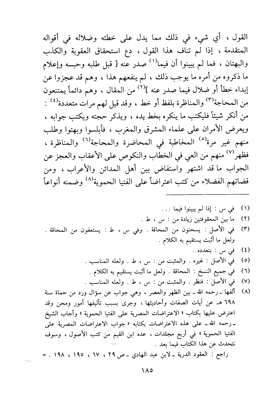 القول، أي شيء في ذلك مما يدل على خطئه وضلاله في أقواله المتقدمة، إذا لم تناف هذا القول، دع استحقاق العقوبة والكذب والبهتان، فما لم يبينوا أن فيما (¬1) صدر عنه [قبل طلبه وحبسه وإعلام ما ذكروه من أمره ما يوجب ذلك، لم ينفعهم هذا، وهم قد عجزوا عن إبداء خطأ أو ضلال فيما صدر عنه] (¬2) من المقال، وهم دائمًا يمتنعون من المحاجة (¬3) والمناظرة بلفظ أو خط، وقد قيل لهم مرات متعددة (¬4): من أنكر شيئًا فليكتب ما ينكره بخط يده، ويذكر حجته ويكتب جوابه، ويعرض الأمران على علماء المشرق والمغرب، فأبلسوا وبهتوا وطلب منهم غير مرة (¬5) المخاطبة في المحاضرة والمحاجة (¬6) والمناظرة، فظهر (¬7) منهم من العي في الخطاب والنكوص على الأعقاب والعجز عن الجواب ما قد اشتهر واستفاض بين أهل المدائن والأعراب، ومن قضاتهم الفضلاء من كتب اعتراضًا على الفتيا الحموية (¬8) وضمنه أنواعًا