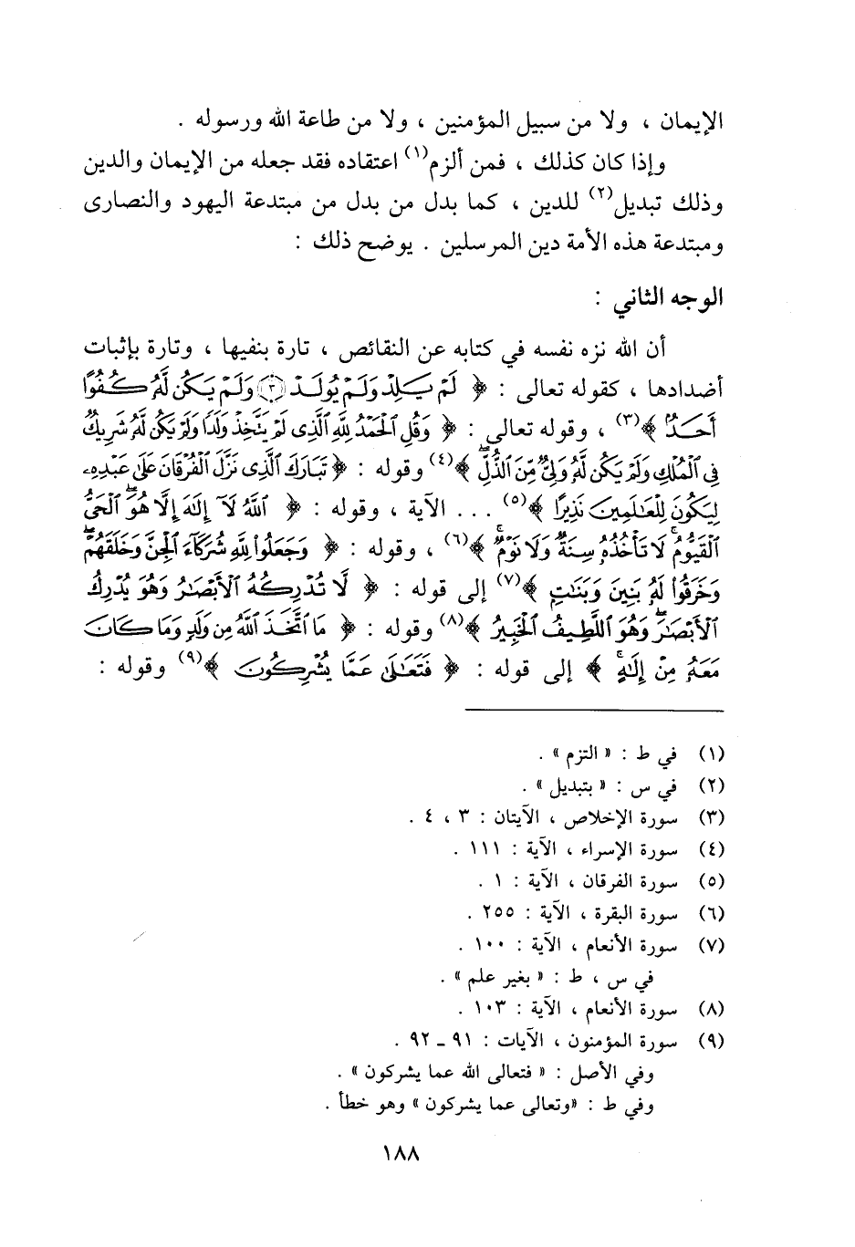 أن الله نزه نفسه في كتابه عن النقائص، تارة بنفيها، وتارة بإثبات أضدادها، كقوله تعالى: {لَمْ يَلِدْ وَلَمْ يُولَدْ (3) وَلَمْ يَكُنْ لَهُ كُفُوًا أَحَدٌ} (¬3)، وقوله تعالى: {وَقُلِ الْحَمْدُ لِلَّهِ الَّذِي لَمْ يَتَّخِذْ وَلَدًا وَلَمْ يَكُنْ لَهُ شَرِيكٌ فِي الْمُلْكِ وَلَمْ يَكُنْ لَهُ وَلِيٌّ مِنَ الذُّلِّ} (¬4) وقوله: {تَبَارَكَ الَّذِي نَزَّلَ الْفُرْقَانَ عَلَى عَبْدِهِ لِيَكُونَ لِلْعَالَمِينَ نَذِيرًا} (¬5). . . الآية، وقوله: {اللَّهُ لَا إِلَهَ إلا هُوَ الْحَيُّ الْقَيُّومُ لَا تَأْخُذُهُ سِنَةٌ وَلَا نَوْمٌ} (¬6)، وقوله: {وَجَعَلُوا لِلَّهِ شُرَكَاءَ الْجِنَّ وَخَلَقَهُمْ وَخَرَقُوا لَهُ بَنِينَ وَبَنَاتٍ} (¬7) إلى قوله: {لَا تُدْرِكُهُ الْأَبْصَارُ وَهُوَ يُدْرِكُ الْأَبْصَارَ وَهُوَ اللَّطِيفُ الْخَبِيرُ} (¬8) وقوله: {مَا اتَّخَذَ اللَّهُ مِنْ وَلَدٍ وَمَا كَانَ مَعَهُ مِنْ إِلَهٍ} إلى قوله: {فَتَعَالَى عَمَّا يُشْرِكُونَ} (¬9) وقوله: