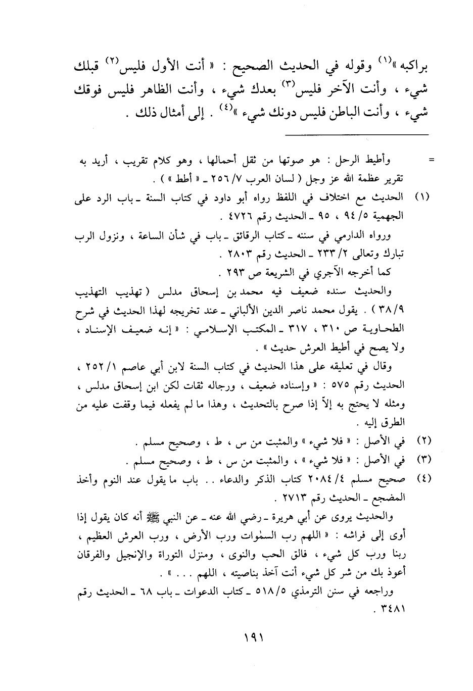 براكبه" (¬1) وقوله في الحديث الصحيح: "أنت الأول فليس (¬2) قبلك شيء، وأنت الآخر فليس (¬3) بعدك شيء، وأنت الظاهر فليس فوقك شيء، وأنت الباطن فليس دونك شيء" (¬4). إلى أمثال ذلك.