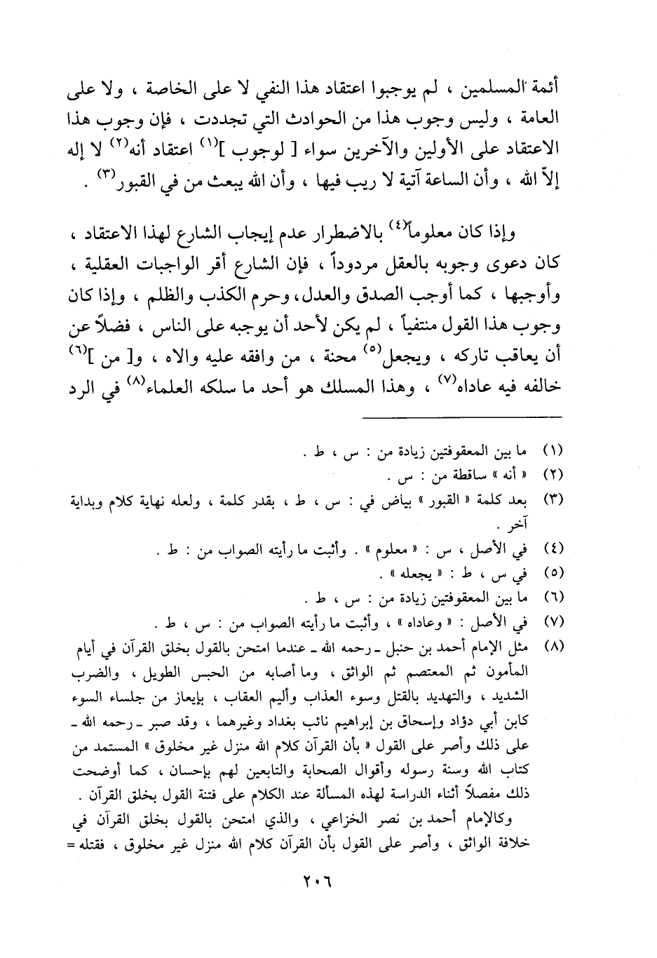 أئمة المسلمين، لم يوجبوا اعتقاد هذا النفي لا على الخاصة، ولا على العامة، وليس وجوب هذا من الحوادث التي تجددت، فإن وجوب هذا الاعتقاد على الأولين والآخرين سواء [لوجوب] (¬1) اعتقاد أنه (¬2) لا إله إلّا الله، وأن الساعة آتية لا ريب فيها، وأن الله يبعث من في القبور (¬3).