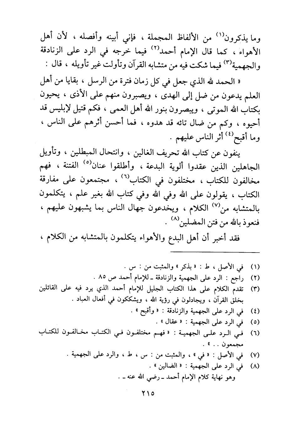 وما يذكرون (¬1) من الألفاظ المجملة، فإني أبينه وأفصله؛ لأن أهل الأهواء، كما قال الإِمام أحمد (¬2) فيما خرجه في الرد على الزنادقة والجهمية (¬3) فيما شكت فيه من متشابه القرآن وتأولت غير تأويله، قال: