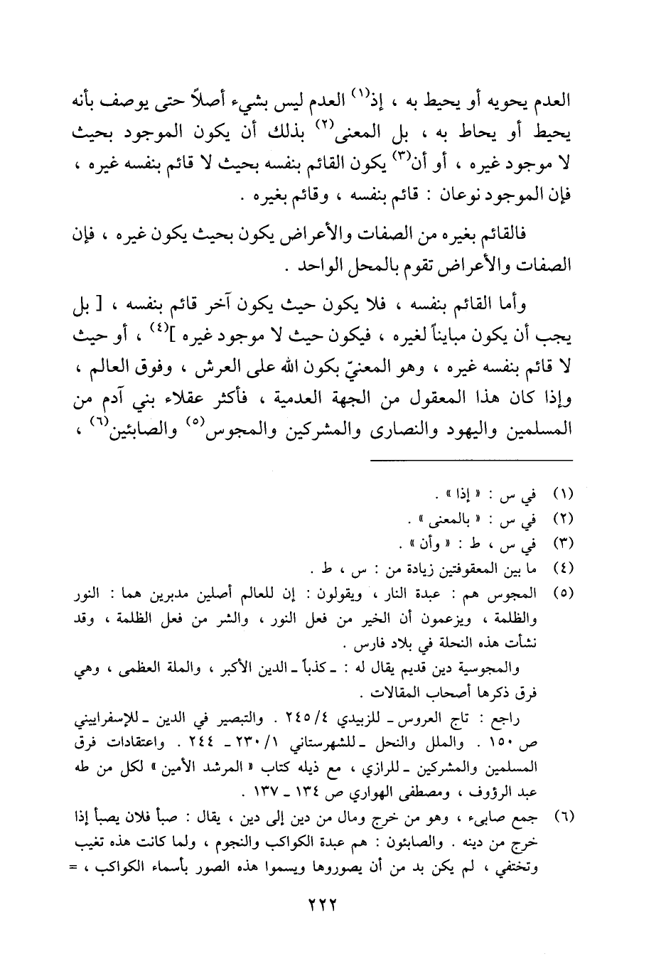 وأما القائم بنفسه، فلا يكون حيث يكون آخر قائم بنفسه، [بل يجب أن يكون مباينًا لغيره، فيكون حيث لا موجود غيره] (¬4)، أو حيث لا قائم بنفسه غيره، وهو المعنيّ بكون الله على العرش، وفوق العالم، وإذا كان هذا المعقول من الجهة العدمية، فأكثر عقلاء بني آدم من المسلمين واليهود والنصارى والمشركين والمجوس (¬5) والصابئين (¬6)،