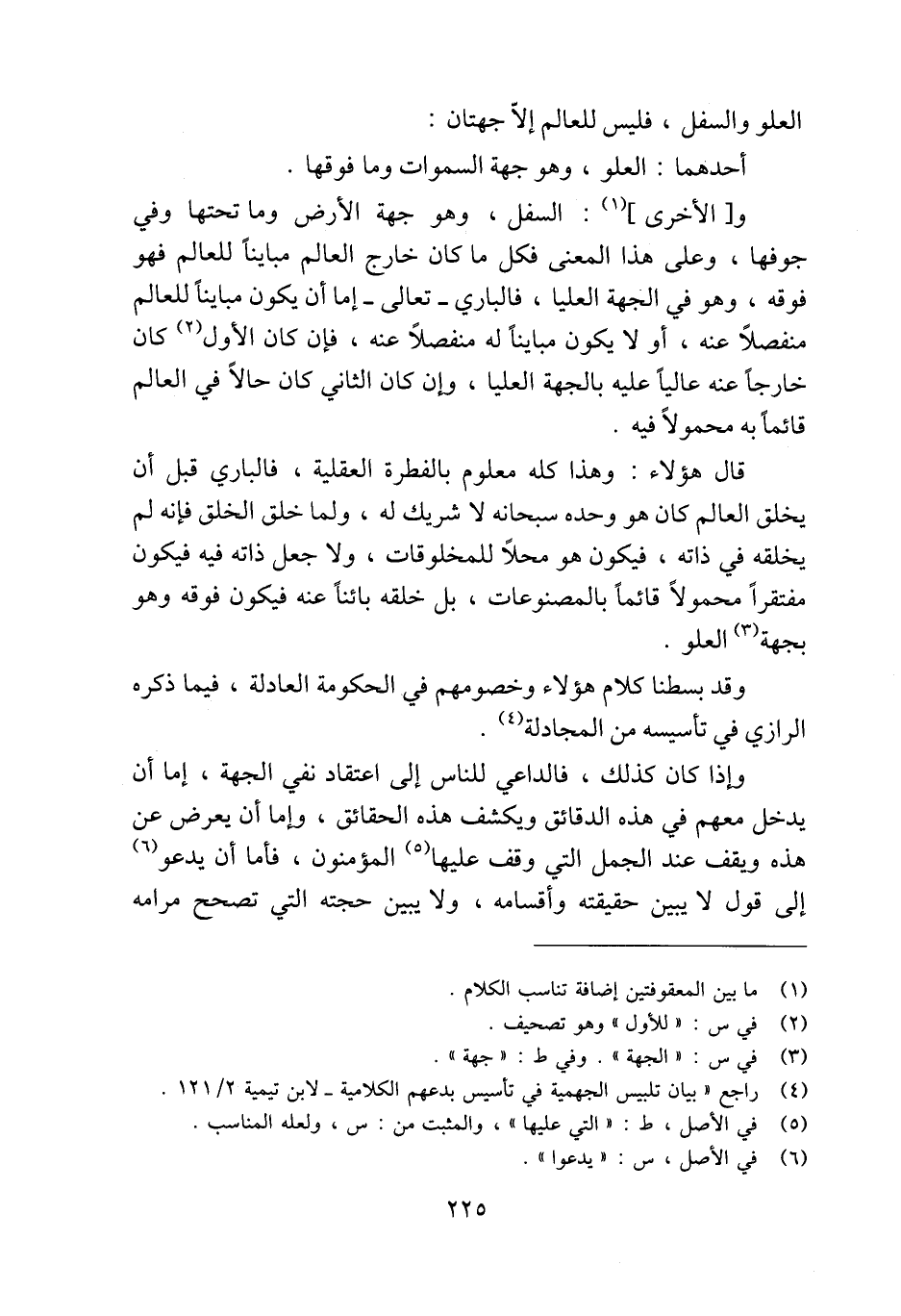 و [الأخرى] (¬1): السفل، وهو جهة الأرض وما تحتها وفي جوفها، وعلى هذا المعنى فكل ما كان خارج العالم مباينًا للعالم فهو فوقه، وهو في الجهة العليا، فالباري -تعالى- إما أن يكون مباينًا للعالم منفصلًا عنه، أو لا يكون مباينًا له منفصلًا عنه، فإن كان الأول (¬2) كان خارجًا عنه عاليًا عليه بالجهة العليا، وإن كان الثاني كان حالًا في العالم قائمًا به محمولًا فيه.