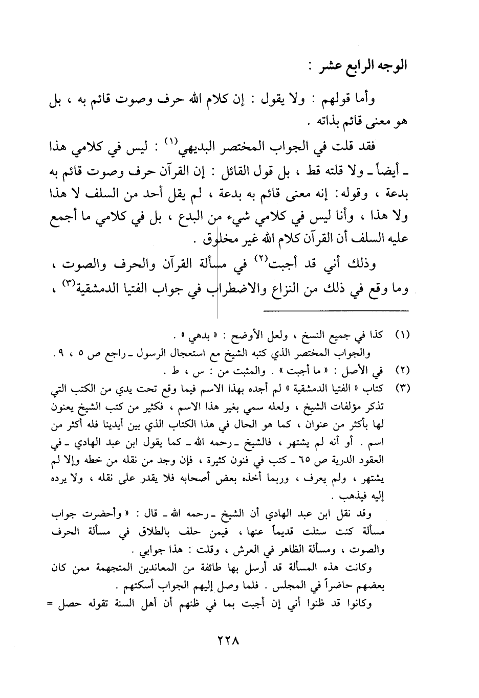 فقد قلت في الجواب المختصر البديهي (¬1): ليس في كلامي هذا -أيضًا- ولا قلته قط، بل قول القائل: إن القرآن حرف وصوت قائم به بدعة، وقوله: إنه معنى قائم به بدعة، ثم يقل أحد من السلف لا هذا ولا هذا، وأنا ليس في كلامي شيء من البدع، بل في كلامي ما أجمع عليه السلف أن القرآن كلام الله مخلوق.