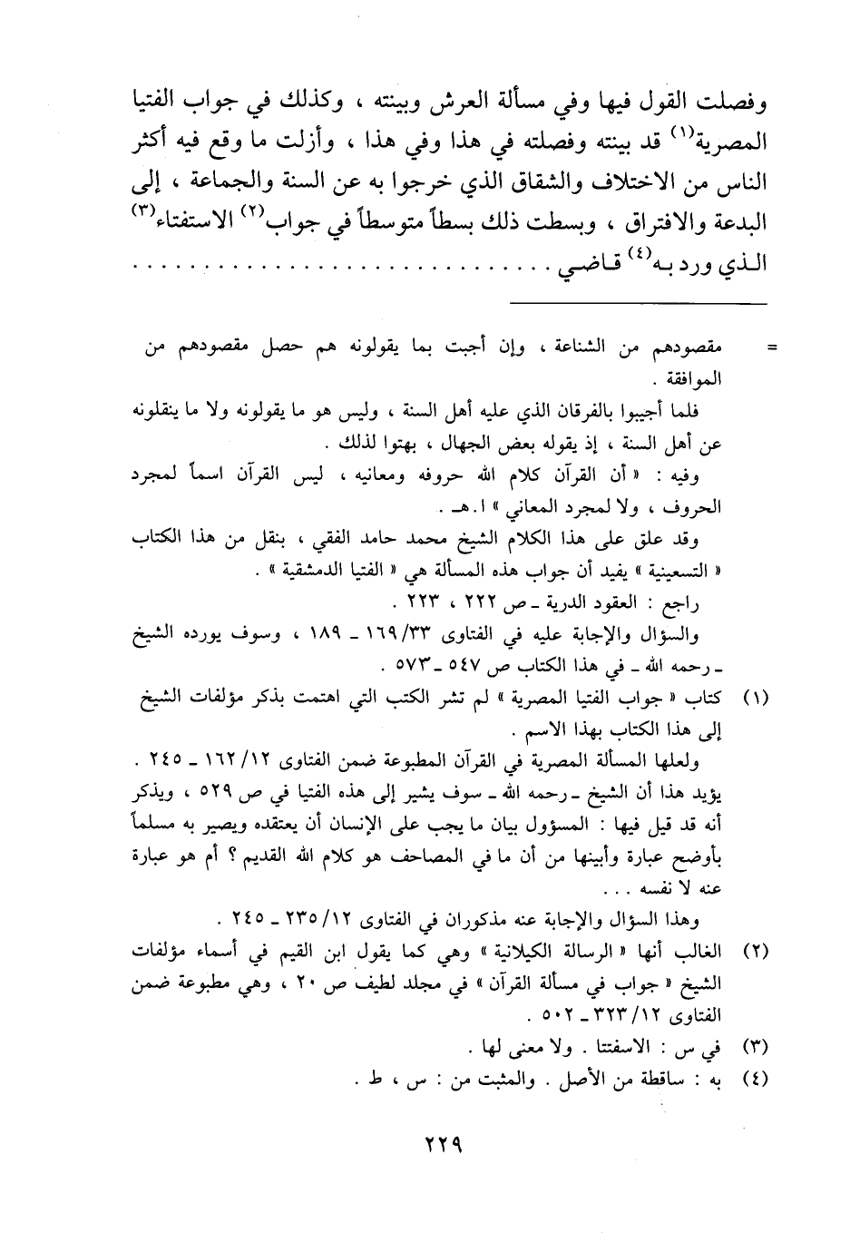 يؤيد هذا أن الشيخ -رحمه الله- سوف يشير إلى هذه الفتيا في ص: 529، ويذكر أنه قد قيل فيها: المسؤول بيان ما يجب على الإنسان أن يعتقده ويصير به مسلمًا بأوضح عبارة وأبينها من أن ما في المصاحف هو كلام الله القديم؟ أم هو عبارة عنه لا نفسه. . .
