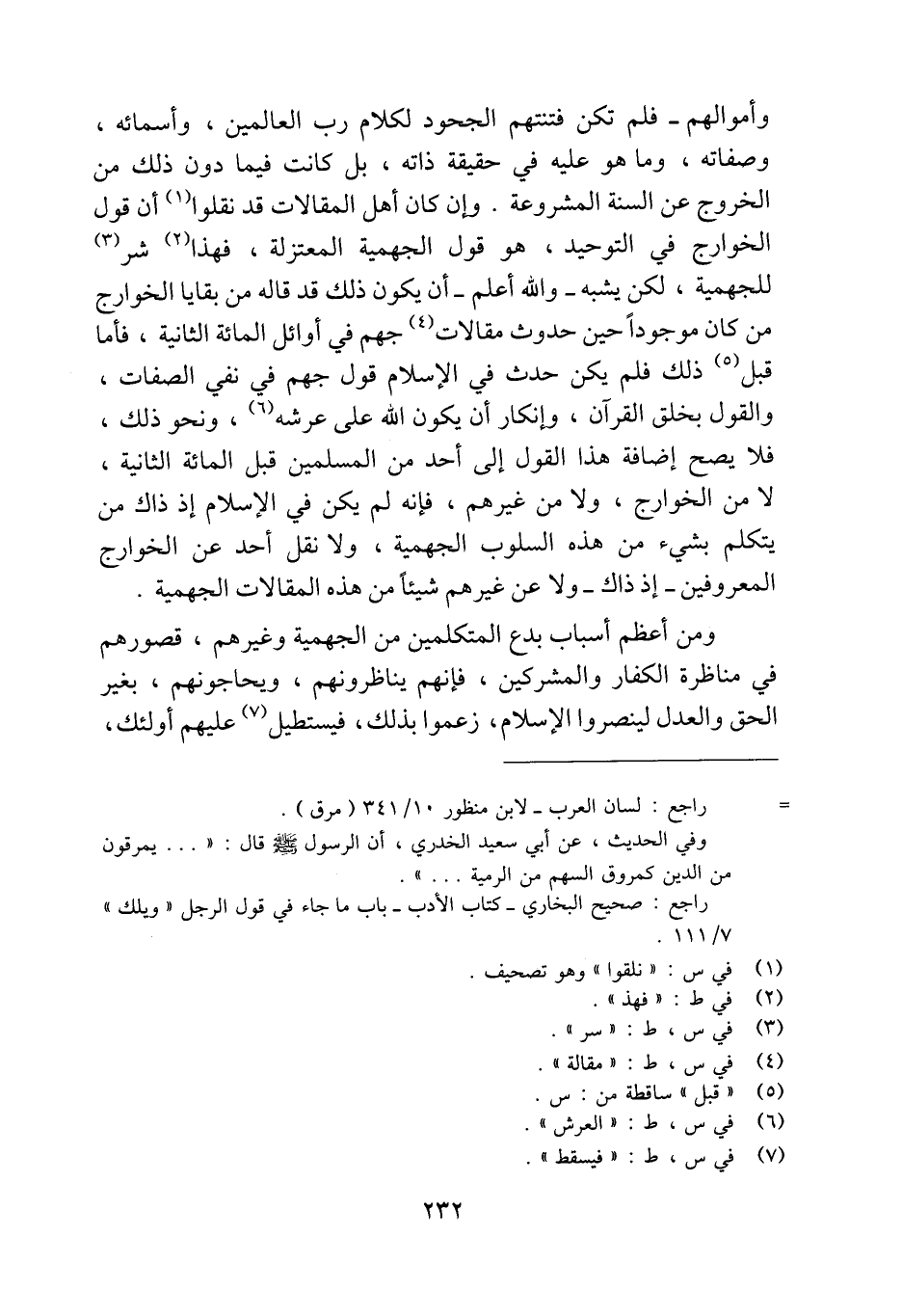 وأموالهم- فلم تكن فتنتهم الجحود لكلام رب العالمين، وأسمائه، وصفاته، وما هو عليه في حقيقة ذاته، بل كانت فيما دون ذلك من الخروج عن السنة المشروعة. وإن كان أهل المقالات قد نقلوا (¬1) أن قول الخوارج في التوحيد، هو قول الجهمية المعتزلة، فهذا (¬2) شر (¬3) للجهمية، لكن يشبه -والله أعلم- أن يكون ذلك قد قاله من بقايا الخوارج من كان موجودًا حين حدوث مقالات (¬4) جهم في أوائل المائة الثانية، فأما قبل (¬5) ذلك فلم يكن حدث في الإِسلام قول جيهم في نفي الصفات، والقول بخلق القرآن، وإنكار أن يكون الله على عرشه (¬6)، ونحو ذلك، فلا يصح إضافة هذا القول إلى أحد من المسلمين قبل المائة الثانية، لا من الخوارج، ولا من غيرهم، فإنه لم يكن في الإِسلام إذ ذاك من يتكلم بشيء من هذه السلوب الجهمية، ولا نقل أحد عن الخوارج المعروفين -إذ ذاك- ولا عن غيرهم شيئًا من هذه المقالات الجهمية.