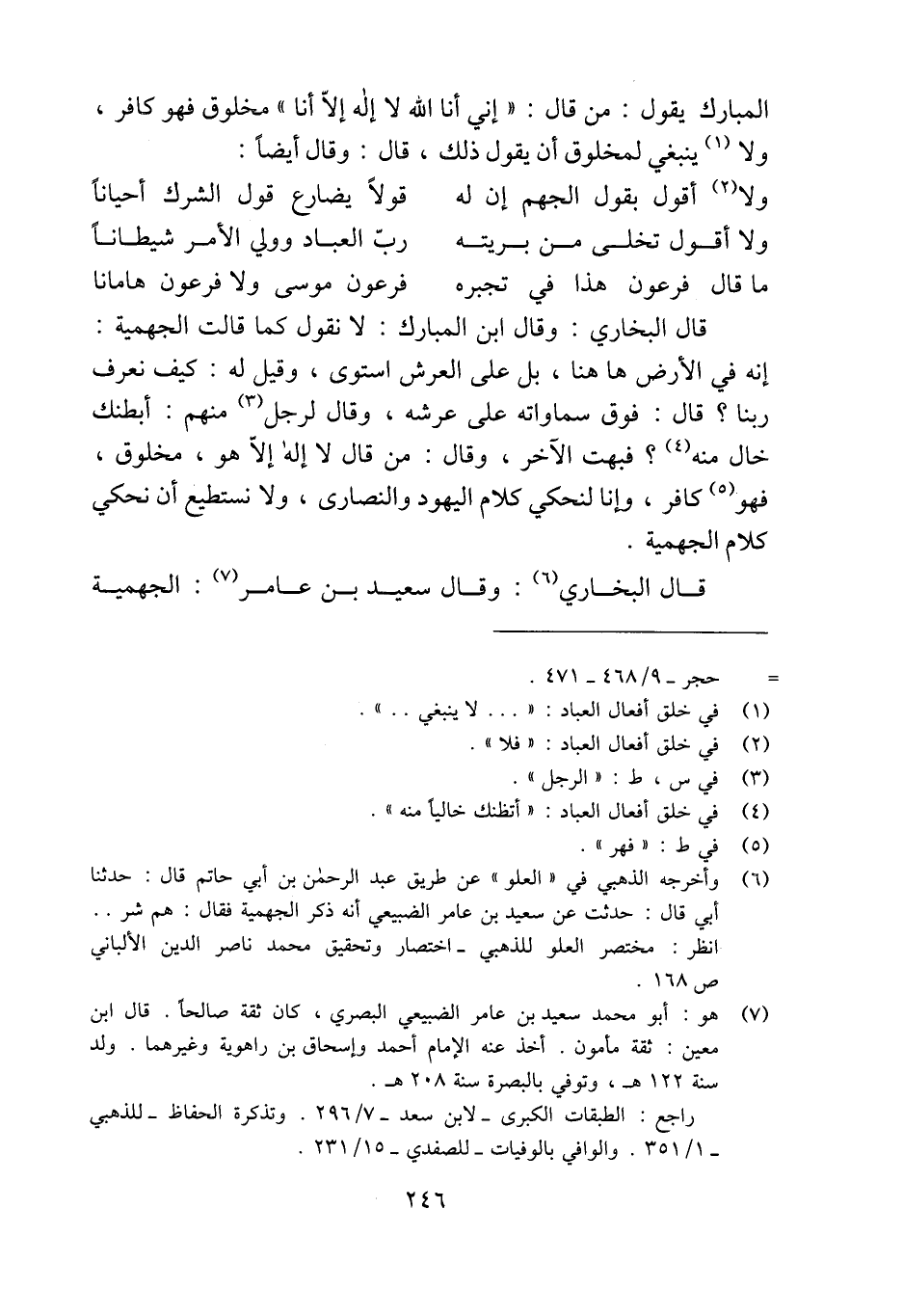 (¬6) وأخرجه الذهبي في "العلو" عن طريق عبد الرحمن بن أبي حاتم قال: حدثنا أبي قال: حدثت عن سعيد بن عامر الضبيعي أنه ذكر الجهمية فقال: هم شر. . انظر: مختصر العلوم للذهبي -اختصار وتحقيق محمَّد ناصر الدين الألباني ص: 168.