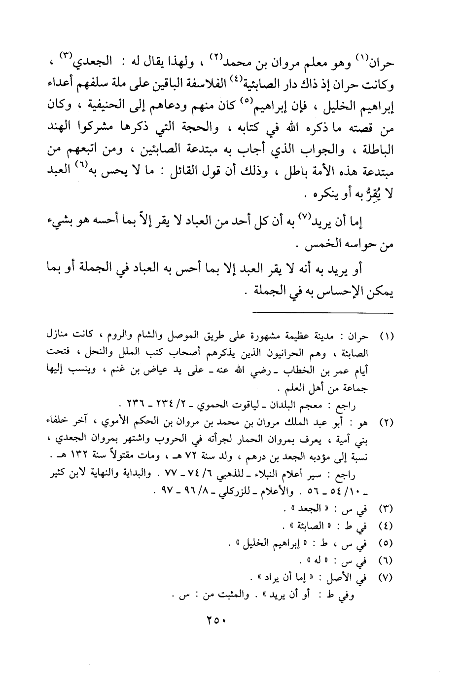 حران (¬1) وهو معلم مروان بن محمَّد (¬2)، ولهذا يقال له: الجعدي (¬3)، وكانت حران إذ ذاك دار الصابئية (¬4) الفلاسفة الباقين على ملة سلفهم أعداء إبراهيم الخليل، فإن إبراهيم (¬5) كان منهم ودعاهم إلى الحنيفية، وكان من قصته ما ذكره الله في كتابه، والحجة التي ذكرها مشركوا الهند الباطلة، والجواب الذي أجاب به مبتدعة الصابئين، ومن اتبعهم من مبتدعة هذه الأمة باطل، وذلك أن قول القائل: ما لا يحس به (¬6) العبد لا يُقِرُّ به أو ينكره.