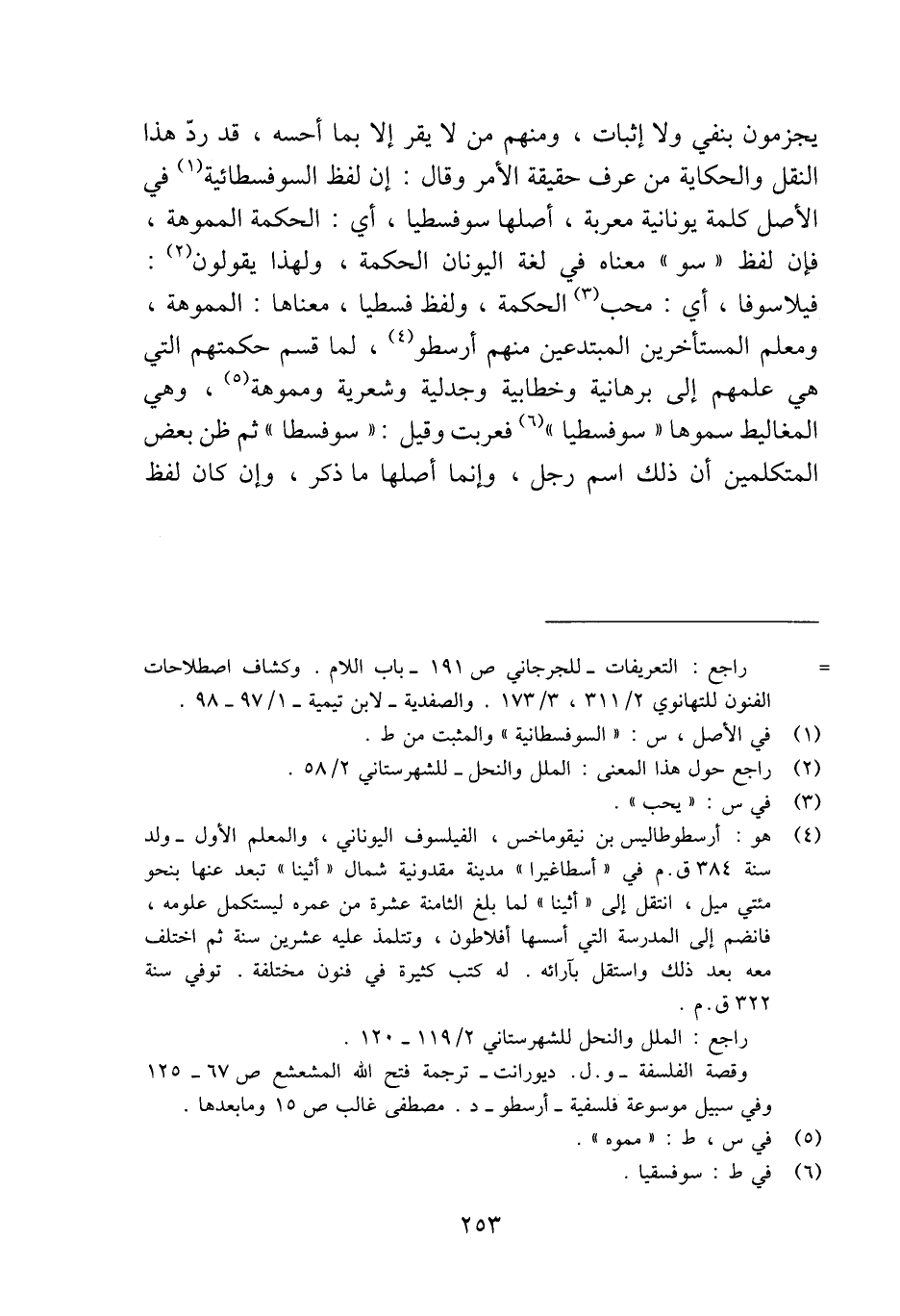 (¬4) هو: أرسطوطاليس بن نيقوماخس، الفيلسوف اليوناني، والمعلم الأول -ولد سنة 384 ق. م في "أسطاغيرا" مدينة مقدونية شمال "أثينا" تبعد عنها بنحو مئتي ميل، انتقل إلى "أثينا" لما بلغ الثامنة عشرة من عمره ليستكمل علومه، فانضم إلى المدرسة التي أسسها أفلاطون، وتتلمذ عليه عشرين سنة ثم اختلف معه بعد ذلك واستقل بآرائه. له كتب كثيرة في فنون مختلفة. توفي سنة 322 ق. م.