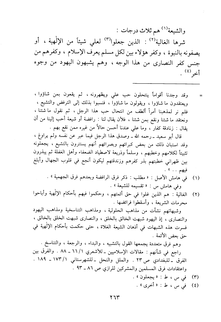 شرها الغالية (¬2): الذين جعلوا (¬3) لعلي شيئًا من الإلهية، أو يصفونه بالنبوة، وكفر هؤلاء بين لكل مسلم يعرف الإسلام، وكفرهم من جنس كفر النصارى من هذا الوجه، وهم يشبهون اليهود من وجوه أخر (¬4).