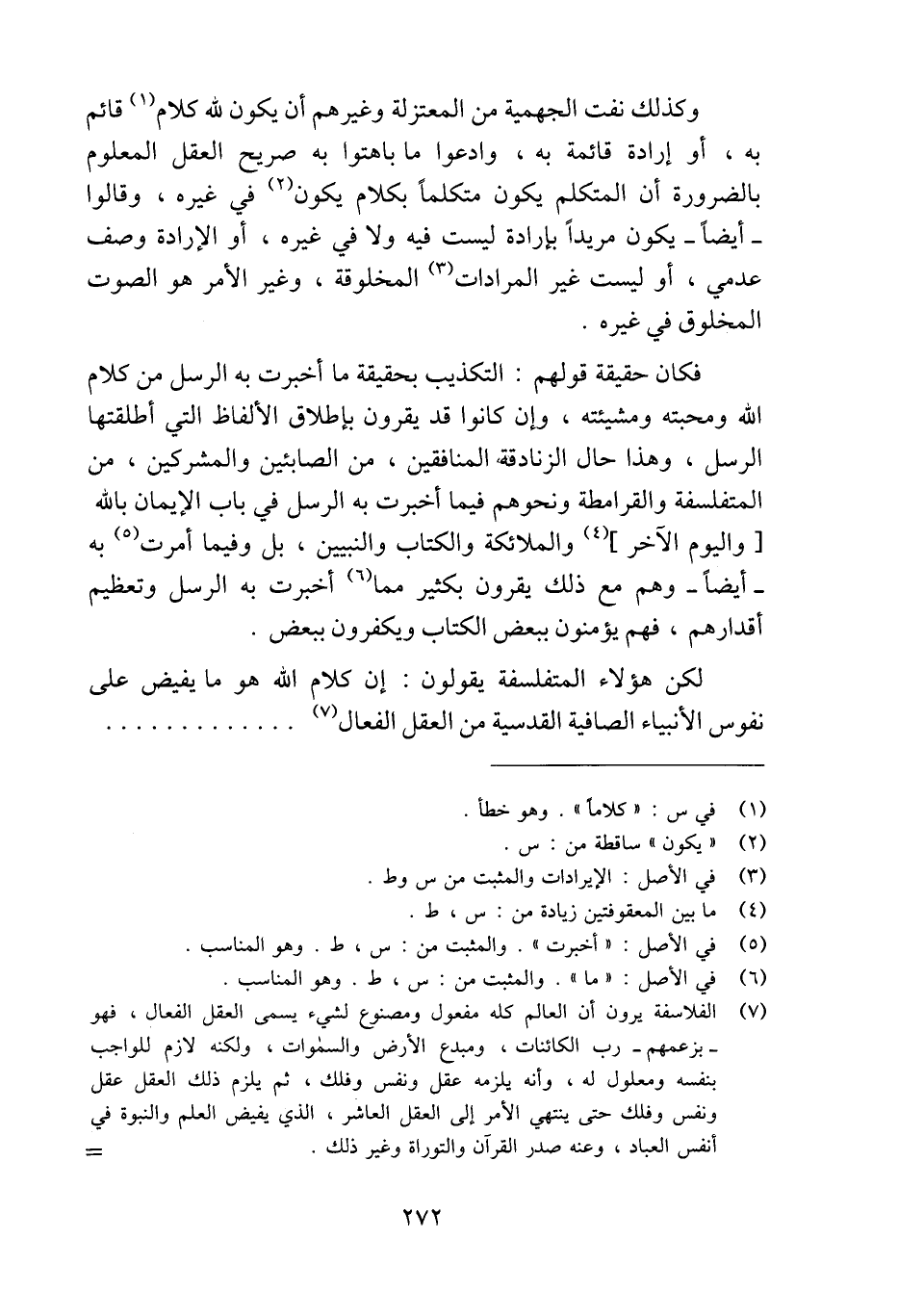 لكن هؤلاء المتفلسفة يقولون: إن كلام الله هو ما يفيض على نفوس الأنبياء الصافية القدسية من العقل الفعال (¬7). . . . . . . . . . . . . .