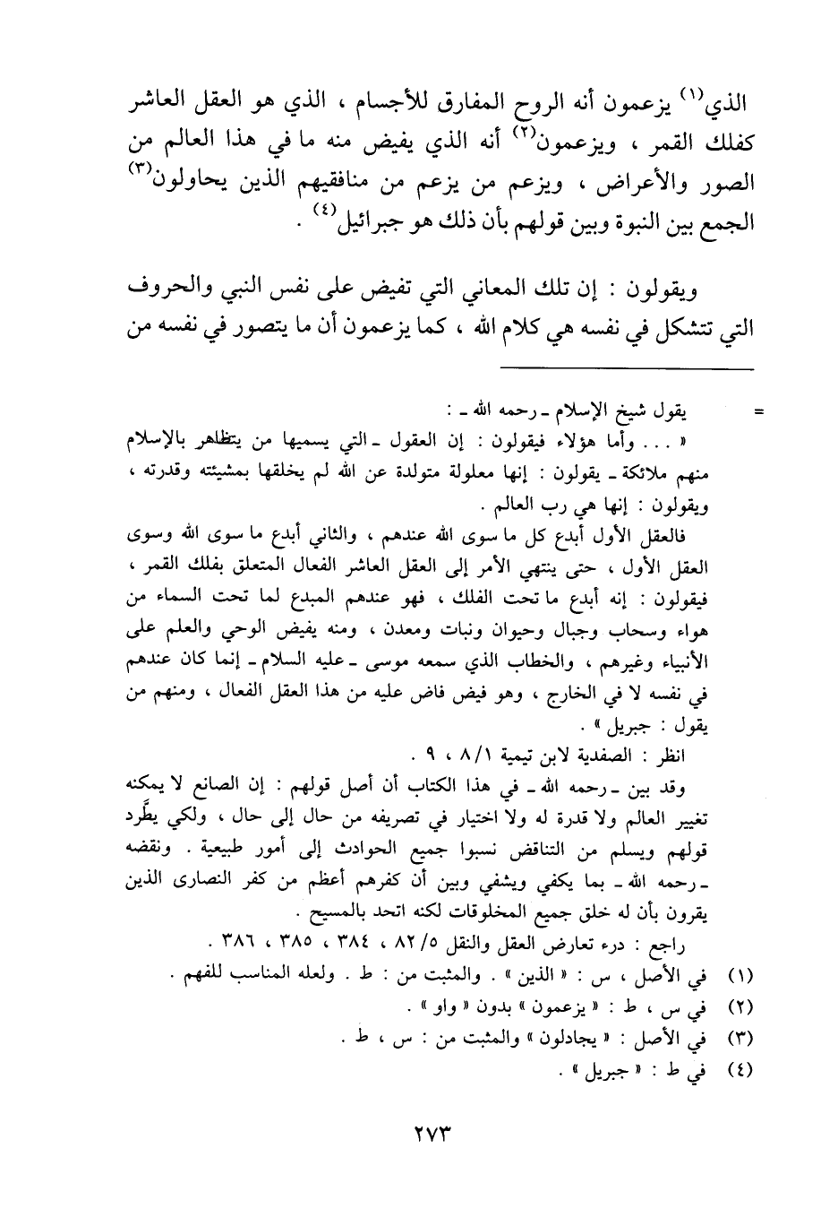 ". . . وأمَّا هؤلاء فيقولون: إن العقول -التي يسميها من يتظاهر بالإسلام منهم ملائكة- يقولون: إنَّها معلولة متولدة عن الله لم يخلقها بمشيئته وقدرته، ويقولون: إنَّها هي رب العالم.