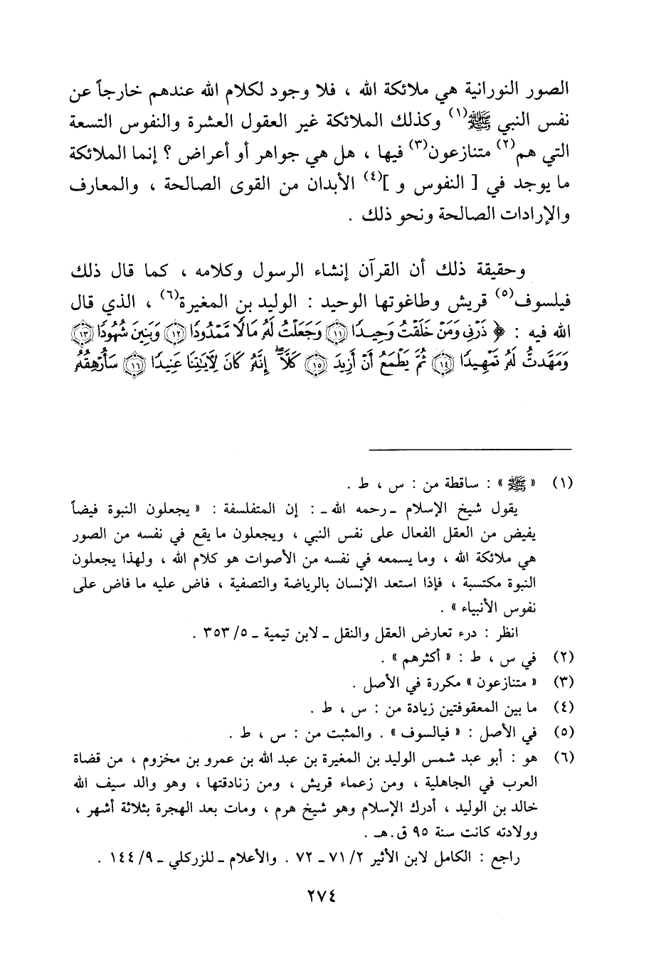 وحقيقة ذلك أن القرآن إنشاء الرسول وكلامه، كما قال ذلك فيلسوف (¬5) قريش وطاغوتها الوحيد: الوليد بن المغيرة (¬6)، الذي قال الله فيه: {ذَرْنِي وَمَنْ خَلَقْتُ وَحِيدًا (11) وَجَعَلْتُ لَهُ مَالًا مَمْدُودًا (12) وَبَنِينَ شُهُودًا (13) وَمَهَّدْتُ لَهُ تَمْهِيدًا (14) ثُمَّ يَطْمَعُ أَنْ أَزِيدَ (15) كَلَّا إِنَّهُ كَانَ لِآيَاتِنَا عَنِيدًا (16) سَأُرْهِقُهُ