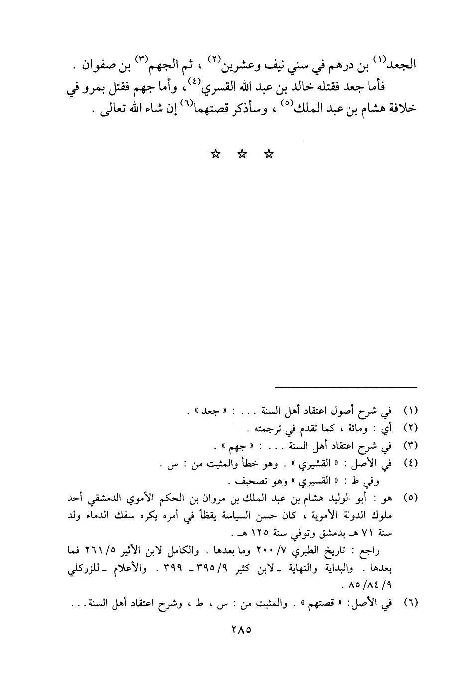 فأمَّا جعد فقتله خالد بن عبد الله القسري (¬4)، وأما جهم فقتل بمرو في خلافة هشام بن عبد الملك (¬5)، وسأذكر قصتهما (¬6) إن شاء الله تعالى.