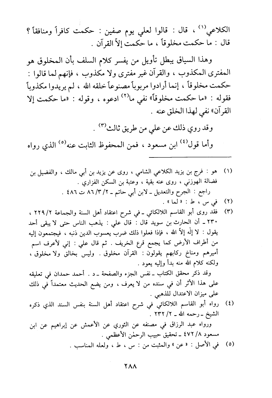 (¬3) فقد روى أبو القاسم اللالكائي- في شرح اعتقاد أهل السنة والجماعة 2/ 229، 230 - أن الحارث بن سويد قال: قال علي: يذهب النَّاس حتَّى لا يبقى أحد يقول: لا إله إلَّا الله، فإذا فعلوا ذلك ضرب يعسوب الدين ذنبه، فيجتمعون إليه من أطراف الأرض كما يجمع قرع الخريف. ثم قال علي: إنِّي لأعرف اسم أميرهم ومناخ ركابهم يقولون: القرآن مخلوق. وليس بخالق ولا مخلوق، ولكنه كلام الله منه بدأ وإليه يعود.