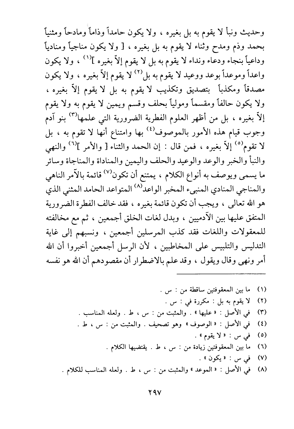 وحديث ونبأ لا يقوم به بل بغيره، ولا يكون حامدًا وذامًا ومادحًا ومثنيًا بحمد وذم ومدح وثناء لا يقوم به بل بغيره، [ولا يكون مناجيًا ومناديًا وداعيًا بنجاء ودعاء ونداء لا يقوم به بل لا يقوم إلّا بغيره] (¬1)، ولا يكون واعدًا وموعدًا بوعد ووعيد لا يقوم به بل (¬2) لا يقوم إلّا بغيره، ولا يكون مصدقًا ومكذبًا بتصديق وتكذيب لا يقوم به بل لا يقوم إلّا بغيره، ولا يكون حالفًا ومقسمًا وموليًا بحلف وقسم ويمين لا يقوم به ولا يقوم إلّا بغيره، بل من أظهر العلوم الفطرية الضرورية التي علمها (¬3) بنو آدم وجوب قيام هذه الأمور بالموصوف (¬4) بها وامتناع أنَّها لا تقوم به، بل لا تقوم (¬5) إلّا بغيره، فمن قال: إن الحمد والثناء [والأمر] (¬6) والنهي والنبأ والخبر والوعد والوعيد والحلف واليمين والمناداة والمناجاة وسائر ما يسمى ويوصف به أنواع الكلام، يمتنع أن تكون (¬7) قائمة بالآمر الناهي والمناجي المنادي المنبيء المخبر الواعد (¬8) المتواعد الحامد المثني الذي هو الله تعالى، ويجب أن تكون قائمة بغيره، فقد خالف الفطرة الضرورية المتفق عليها بين الآدميين، وبدل لغات الخلق أجمعين، ثم مع مخالفته للمعقولات واللغات فقد كذب المرسلين أجمعين، ونسبهم إلى غاية التدليس والتلبيس على المخاطبين، لأنَّ الرسل أجمعين أخبروا أن الله أمر ونهى وقال ويقول، وقد علم بالاضطرار أن مقصودهم أن الله هو نفسه