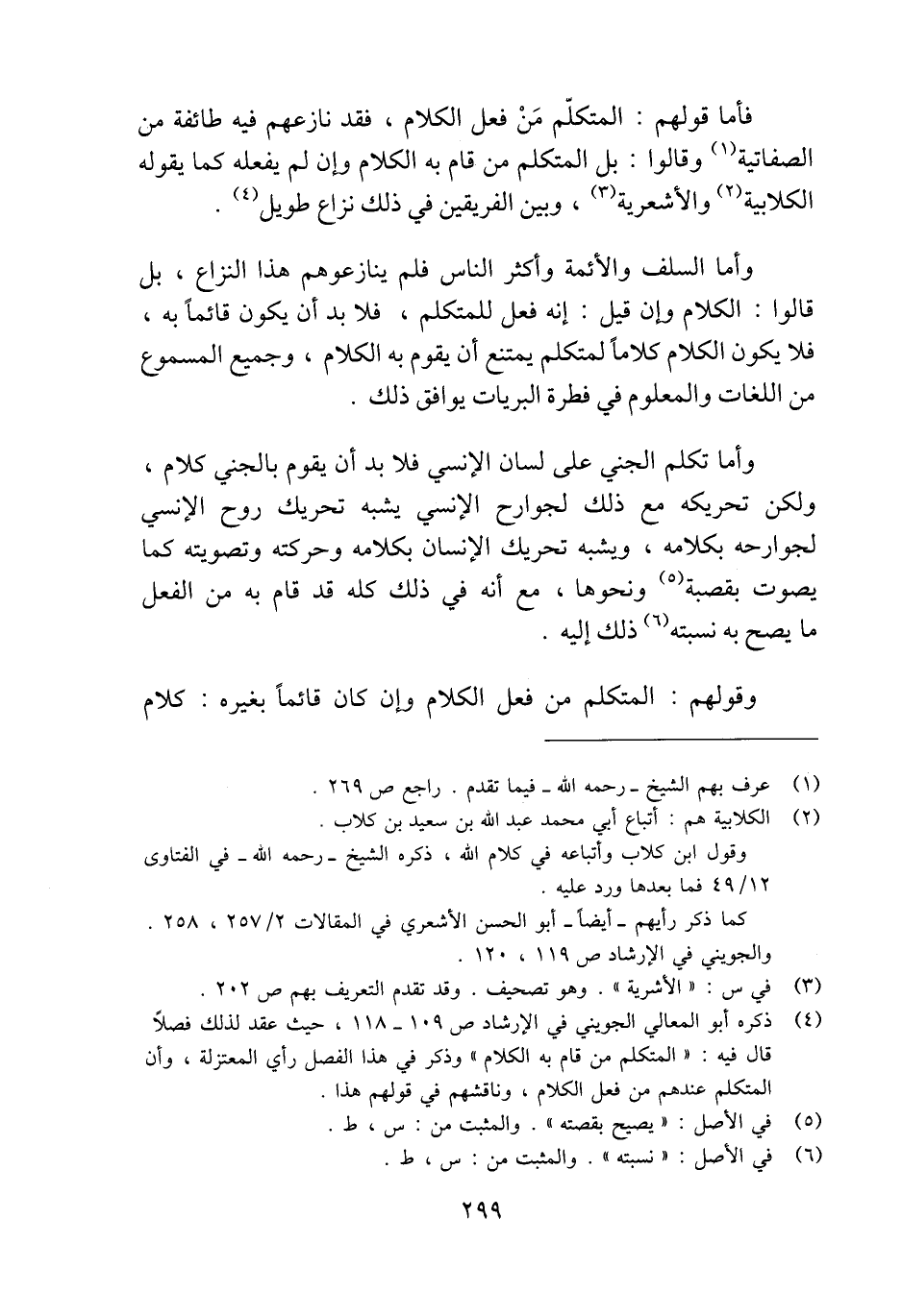 (¬4) ذكره أبو المعالي الجويني في الإرشاد ص: 109 - 118، حيث عقد لذلك فصلًا قال فيه: "المتكلم من قام به الكلام" وذكر في هذا الفصل رأي المعتزلة، وأن المتكلم عندهم من فعل الكلام، وناقشهم في قولهم هذا.