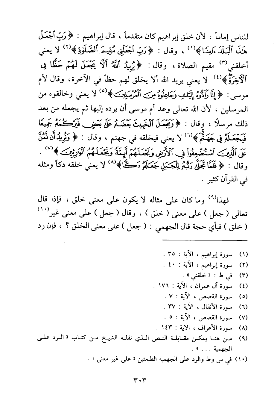 للناس إمامًا، لأن خلق إبراهيم كان متقدمًا، قال إبراهيم: {رَبِّ اجْعَلْ هَذَا الْبَلَدَ آمِنًا} (¬1)، وقال: {رَبِّ اجْعَلْنِي مُقِيمَ الصَّلَاةِ} (¬2) لا يعني أخلقني (¬3) مقيم الصلاة، وقال: {يُرِيدُ اللَّهُ أَلَّا يَجْعَلَ لَهُمْ حَظًّا فِي الْآخِرَةِ} (¬4) لا يعني يريد الله ألا يخلق لهم حظًّا في الآخرة، وقال لأم موسى: {إِنَّا رَادُّوهُ إِلَيْكِ وَجَاعِلُوهُ مِنَ الْمُرْسَلِينَ} (¬5) لا يعني وخالقوه من المرسلين، لأن الله تعالى وعد أم موسى أن يرده إليها ثم يجعله من بعد ذلك مرسلًا، وقال: {وَيَجْعَلَ الْخَبِيثَ بَعْضَهُ عَلَى بَعْضٍ فَيَرْكُمَهُ جَمِيعًا فَيَجْعَلَهُ فِي جَهَنَّمَ} (¬6) لا يعني فيخلقه في جهنم، وقال: {وَنُرِيدُ أَنْ نَمُنَّ عَلَى الَّذِينَ اسْتُضْعِفُوا فِي الْأَرْضِ وَنَجْعَلَهُمْ أَئِمَّةً وَنَجْعَلَهُمُ الْوَارِثِينَ} (¬7). وقال: {فَلَمَّا تَجَلَّى رَبُّهُ لِلْجَبَلِ جَعَلَهُ دَكًّا} (¬8) لا يعني خلقه دكًّا ومثله في القرآن كثير.