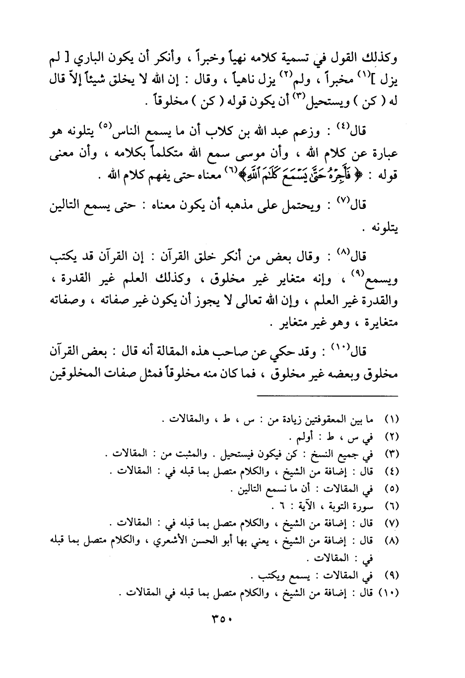 (¬8) قال: إضافة من الشيخ، يعني بها أبو الحسن الأشعري، والكلام متصل بما قبله في: المقالات.