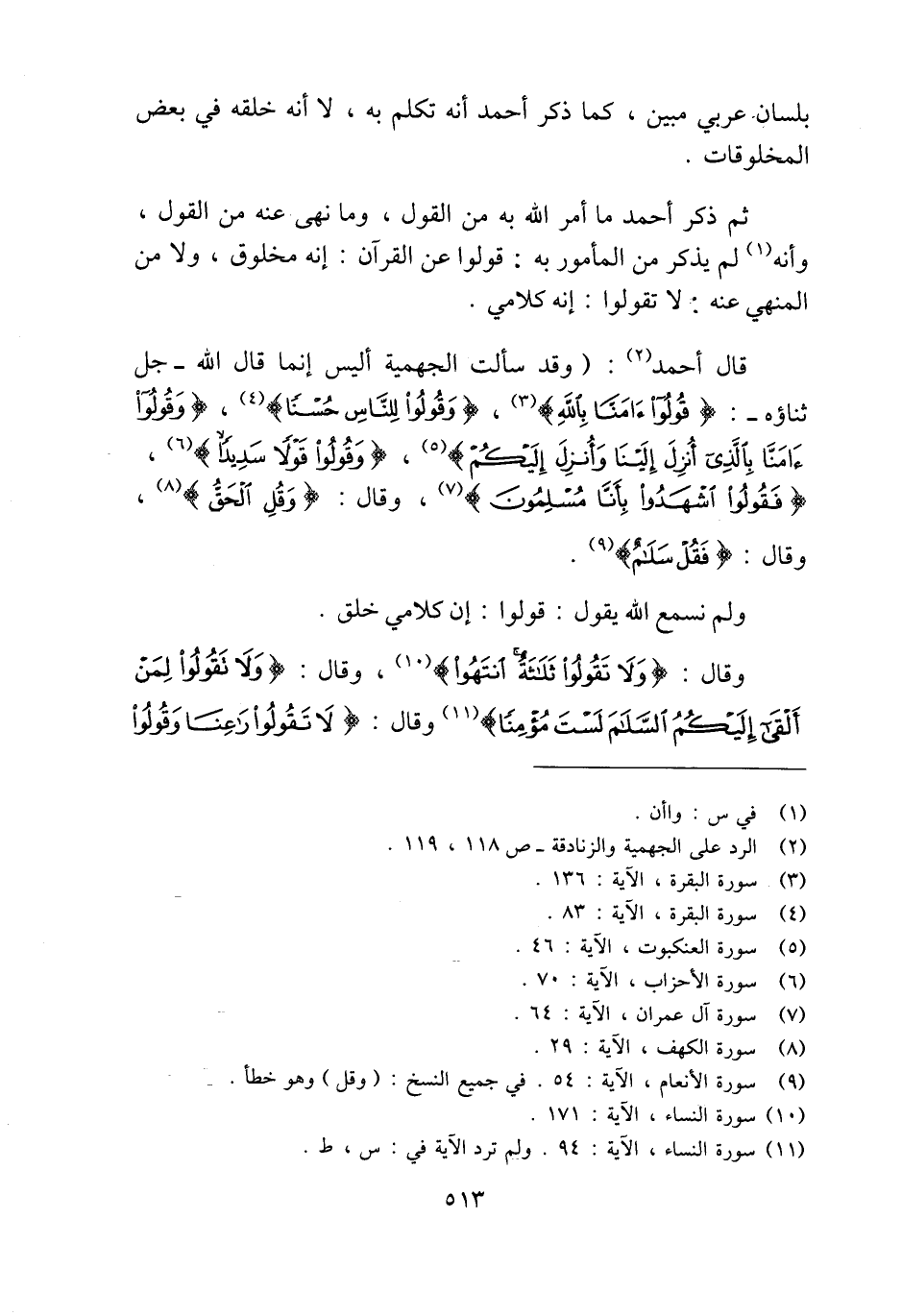 ثم ذكر أحمد ما أمر الله به من القول، وما نهى عنه من القول، وأنه (¬1) لم يذكر من المأمور به: قولوا عن القرآن: إنه مخلوق، ولا من المنهي عنه: لا تقولوا: إنه كلامي. قال أحمد (¬2): (وقد سألت الجهمية أليس إنما قال الله - جل ثناؤه -: {قُولُوا آمَنَّا بِاللَّهِ} (¬3)، {وَقُولُوا للِنَّاسِ حُسْنًا} (¬4)، {وَقُولُوا آمَنَّا بِالَّذِي أُنْزِلَ إِلَيْنَا وَأُنْزِلَ إِلَيْكُمْ} (¬5)، {وَقُولُوا قَوْلًا سَدِيدًا} (¬6)، {فَقُولُوا اشْهَدُوا بِأَنَّا مُسْلِمُونَ} (¬7)، وقال: {وَقُلِ الْحَقُّ} (¬8)، وقال: {فَقُلْ سَلَامٌ} (¬9).
