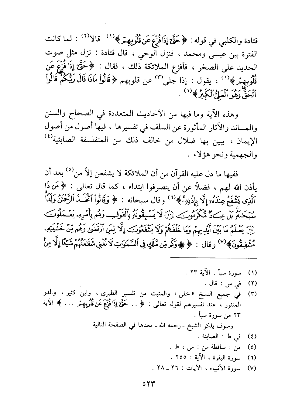 (¬3) في جميع النسخ "خلى" والمثبت من تفسير الطبري، وابن كثير، والدر المنثور، عند تفسيرهم لقوله تعالى: {. . حَتَّى إِذَا فُزِّعَ عَنْ قُلُوبِهِمْ. . .} الآية 23 من سورة سبأ.