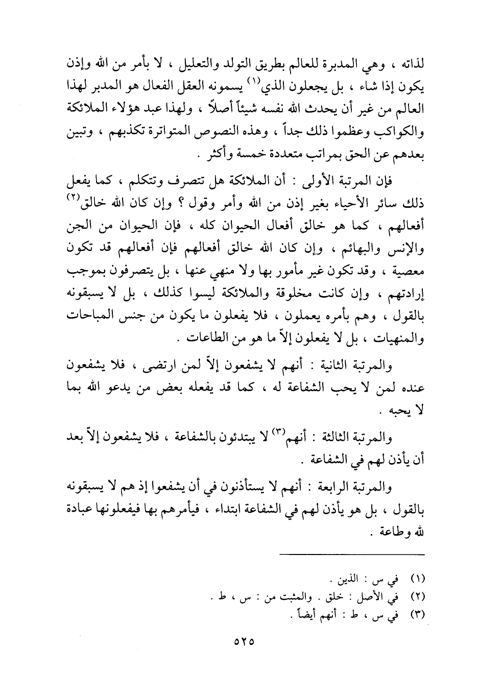 فإن المرتبة الأولى: أن الملائكة هل تتصرف وتتكلم، كما يفعل ذلك سائر الأحياء بغير إذن من الله وأمر وقول؟ وإن كان الله خالق (¬2) أفعالهم، كما هو خالق أفعال الحيوان كله، فإن الحيوان من الجن والإنس والبهائم، وإن كان الله خالق أفعالهم فإن أفعالهم قد تكون معصية، وقد تكون غير مأمور بها ولا منهي عنها، بل يتصرفون بموجب إرادتهم، وإن كانت مخلوقة والملائكة ليسوا كذلك، بل لا يسبقونه بالقول، وهم بأمره يعملون، فلا يفعلون ما يكون من جنس المباحات والمنهيات، بل لا يفعلون إلّا ما هو من الطاعات.