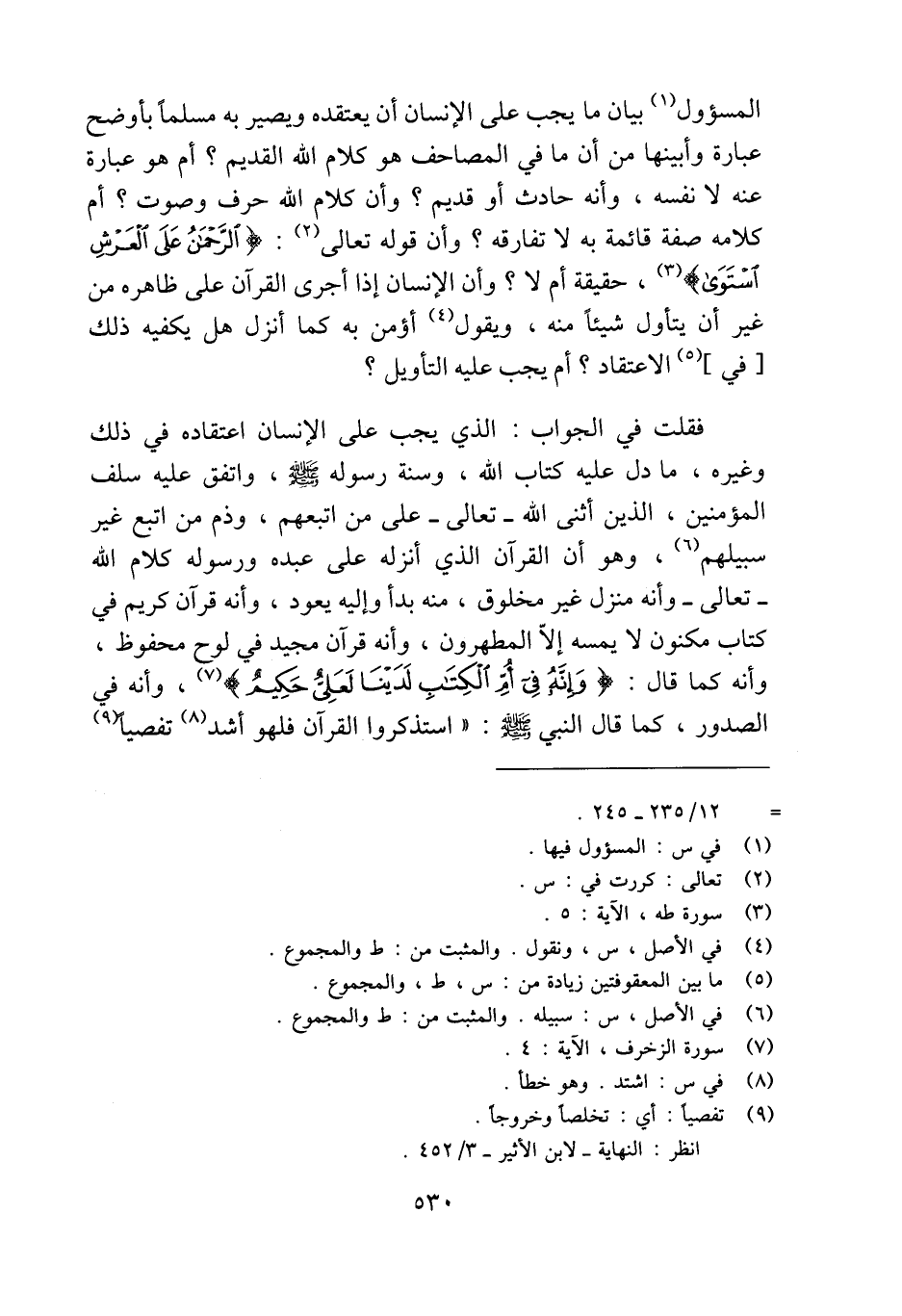 المسؤول (¬1) بيان ما يجب على الإنسان أن يعتقده ويصير به مسلمًا بأوضح عبارة وأبينها من أن ما في المصاحف هو كلام الله القديم؟ أم هو عبارة عنه لا نفسه، وأنه حادث أو قديم؟ وأن كلام الله حرف وصوت؟ أم كلامه صفة قائمة به لا تفارقه؟ وأن قوله تعالى (¬2): {الرَّحْمَنُ عَلَى الْعَرْشِ اسْتَوَى} (¬3)، حقيقة أم لا؟ وأن الإنسان إذا أجرى القرآن على ظاهره من غير أن يتأول شيئًا منه، ويقول (¬4) أؤمن به كما أنزل هل يكفيه ذلك [في] (¬5) الاعتقاد؟ أم يجب عليه التأويل؟