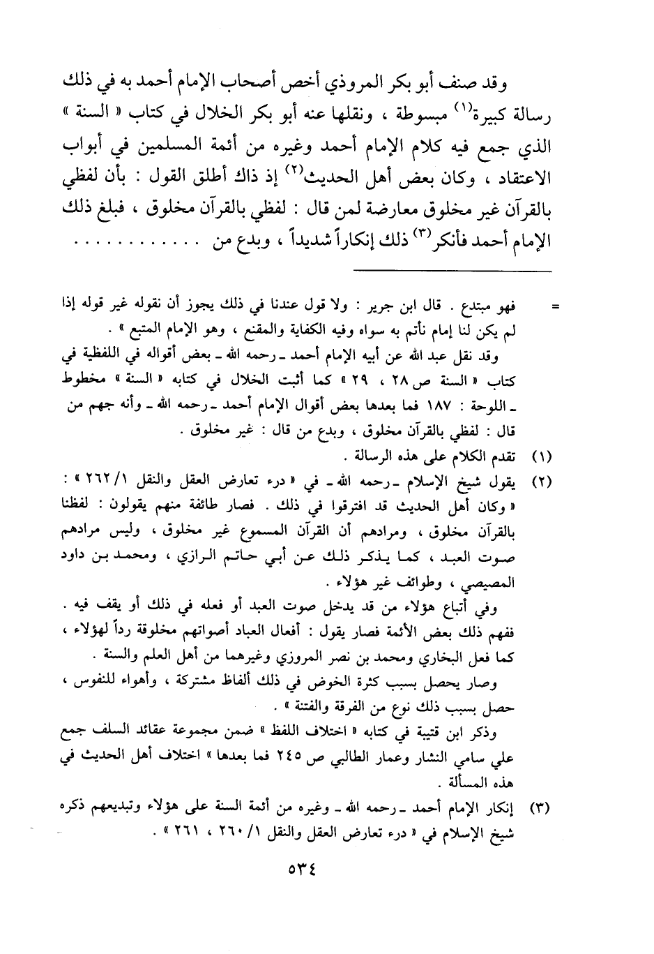 (¬3) إنكار الإمام أحمد -رحمه الله- وغيره من أئمة السنة على هؤلاء وتبديعهم ذكره شيخ الإسلام في "درء تعارض العقل والنقل 1/ 260، 261 ".