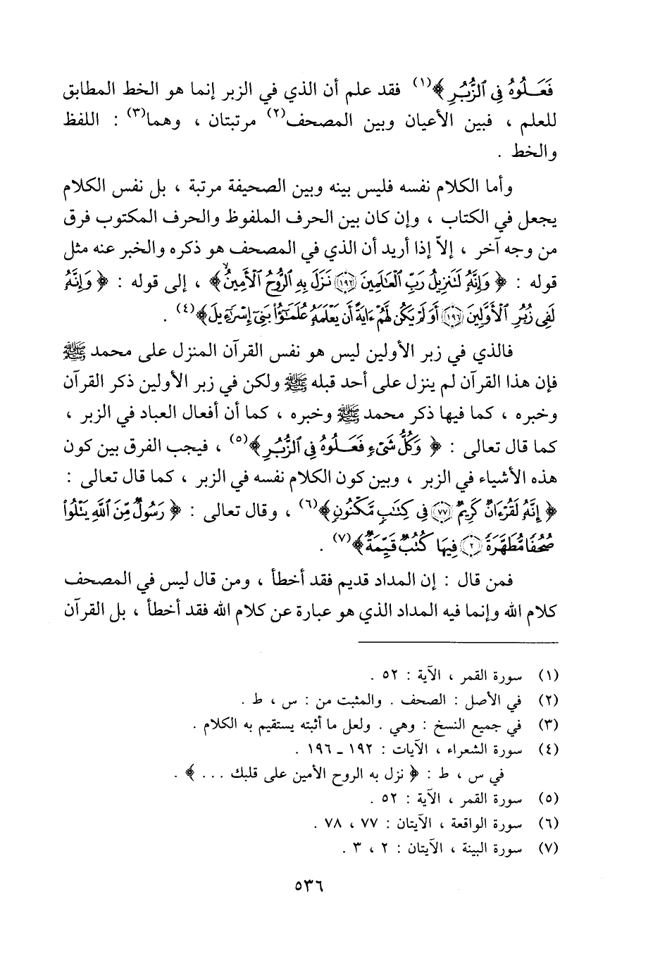 وأما الكلام نفسه فليس بينه وبين الصحيفة مرتبة، بل نفس الكلام يجعل في الكتاب، وإن كان بين الحرف الملفوظ والحرف المكتوب فرق من وجه آخر، إلَّا إذا أريد أن الَّذي في المصحف هو ذكره والخبر عنه مثل قوله: {إِنَّهُ لَتَنْزِيلُ رَبِّ الْعَالَمِينَ (192) نَزَلَ بِهِ الرُّوحُ الْأَمِينُ}، إلى قوله: {وَإِنَّهُ لَفِي زُبُرِ الْأَوَّلِينَ (196) أَوَلَمْ يَكُنْ لَهُمْ آيَةً أَنْ يَعْلَمَهُ عُلَمَاءُ بَنِي إِسْرَائِيلَ} (¬4).