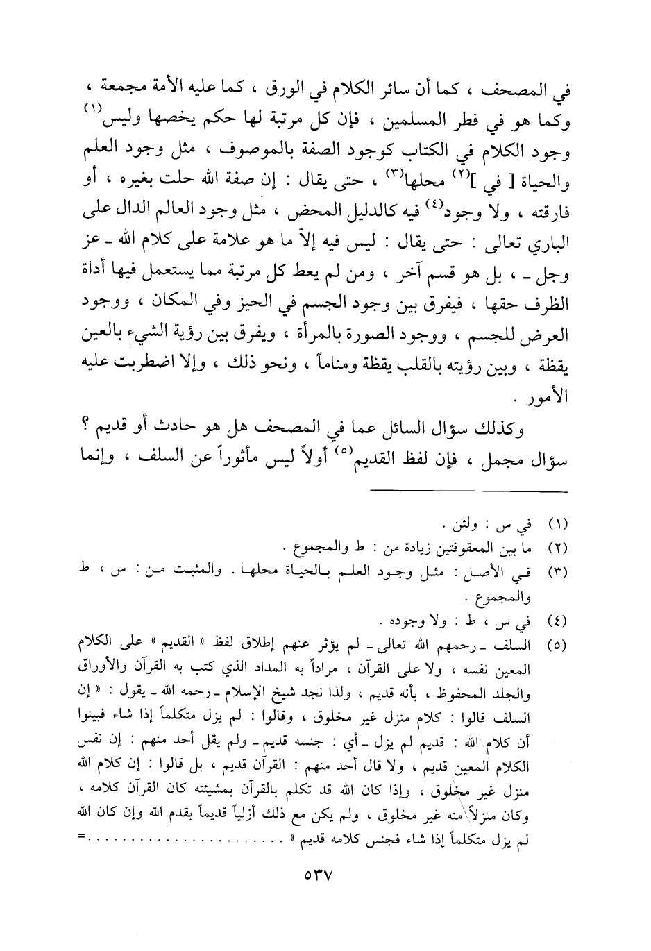(¬5) السلف -رحمهم الله تعالى- لم يؤثر عنهم إطلاق لفظ "القديم" على الكلام المعين نفسه، ولا على القرآن، مرادًا به المداد الَّذي كتب به القرآن والأوراق والجلد المحفوظ، بأنه قديم، ولذا نجد شيخ الإسلام -رحمه الله- يقول: "إن السلف قالوا: كلام منزل غير مخلوق، وقالوا: لم يزل متكلمًا إذا شاء فبينوا أن كلام الله: قديم لم يزل -أي: جنسه قديم- ولم يقل أحد منهم: إن نفس الكلام المعين قديم، ولا قال أحد منهم: القرآن قديم، بل قالوا: إن كلام الله منزل غير مخلوق، وإذا كان الله قد تكلم بالقرآن بمشيئته كان القرآن كلامه، وكان منزلًا منه غير مخلوق، ولم يكن مع ذلك أزليًّا قديمًا بقدم الله وإن كان الله لم يزل متكلمًا إذا شاء فجنس كلامه قديم". . . . . . . . . . . . . . . . . . . . . . . . . . . . . . . . . . . . . =
